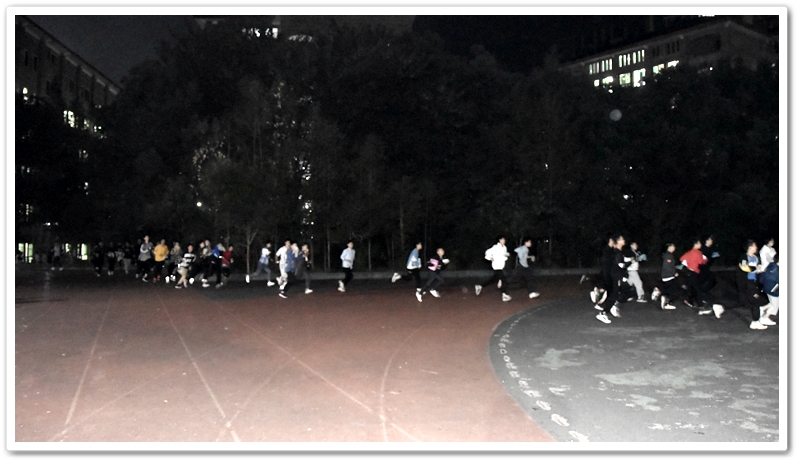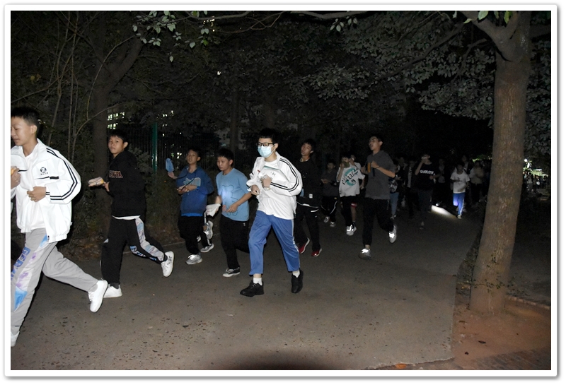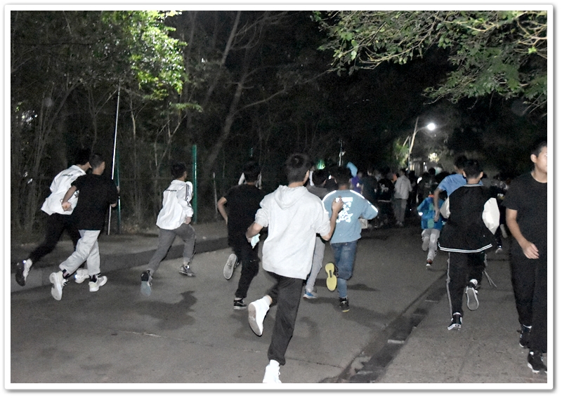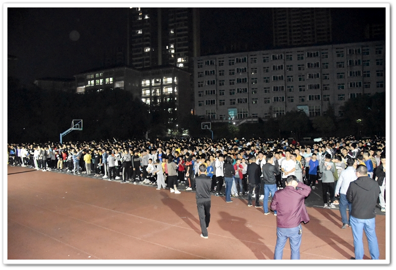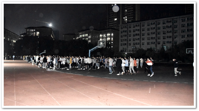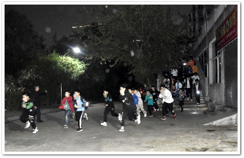 晚上6:40,警报拉响。同学们用湿毛巾捂紧嘴鼻,一路碎步小跑奔下楼梯,从宿舍楼东、西两侧通道鱼贯而出,在德育处及各年级负责人和老师们的指引下一路前行,分别由东、西两个方向迅速汇入小学生运动场安全集结点。