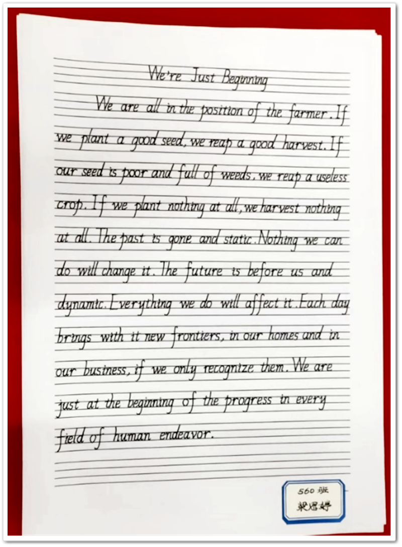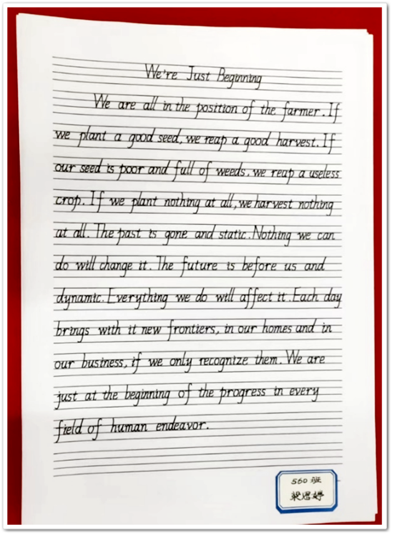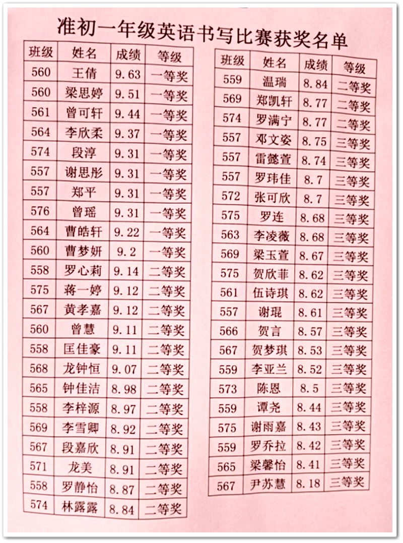 为丰富准初一学生文化生活,培养良好书写习惯,感受英语书写之美,激发学生对英语学习的兴趣爱好,让学生学会创造美、欣赏美,给学生提供一个展示自我的舞台,11月22日和24日晚,准初一年级开展了英语书写比赛。在进一步引导学生重视英语书写的同时,营造了互相交流,取长补短的学习氛围。