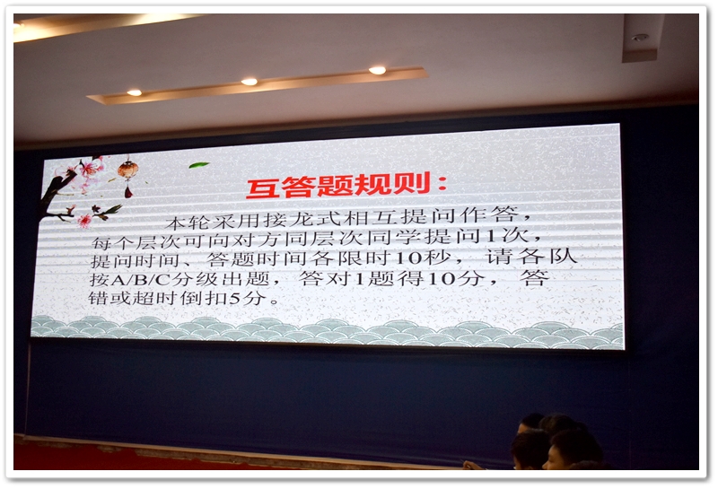 11月25日晚。校报告厅。晚风吹进金桂芳香,又飘出“沙沙沙”的笔纸答题声。特别是16组选手之间的提问和竞答声,铿锵有力,不时传出阵阵掌声。