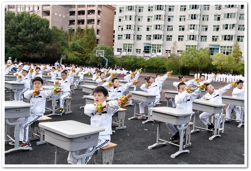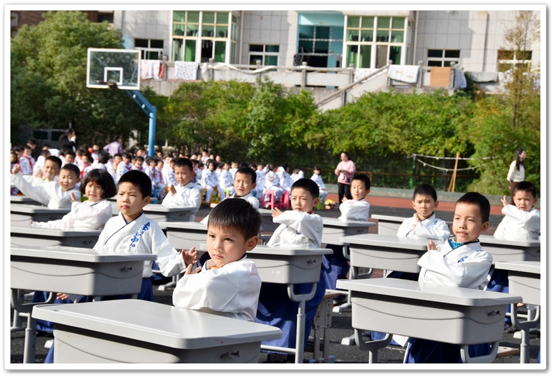 别看我们的年纪小,可是我们的志气高,从小学好功夫,长大保卫祖国。442班同学带起红红的拳套,用刚劲有力的动作为我们表演了课桌舞《功夫fun》。