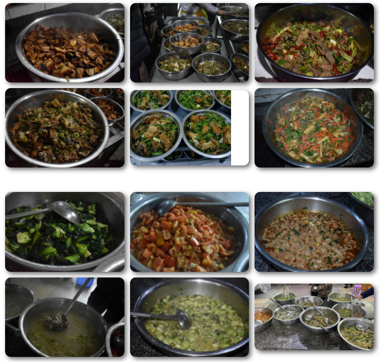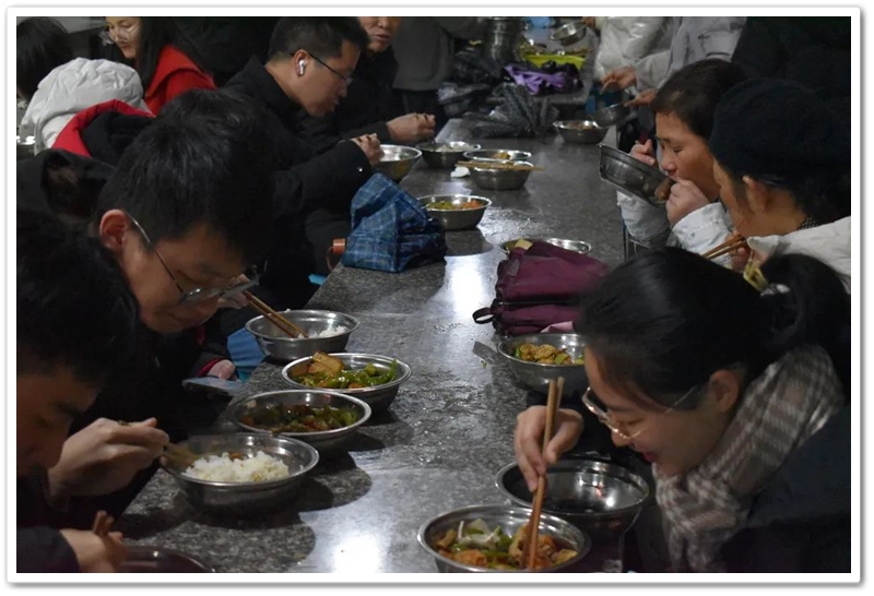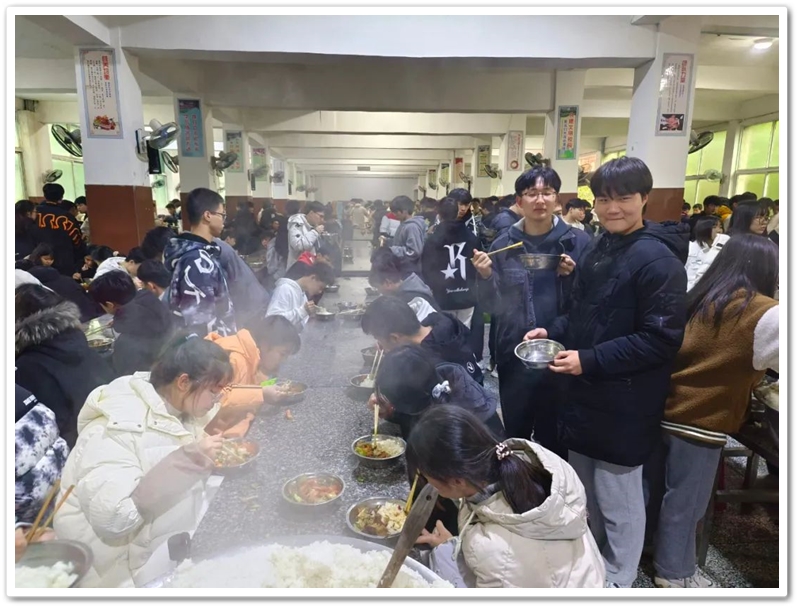 食堂里,中餐晚餐形式一如既往,简朴;节奏一如既往,明快。丰盛之处就是将同学们平日里喜闻乐见的几样硬菜一次备足,敞开任取。丝瓜、莴笋、胡萝卜肉片、西红柿炒蛋、海带骨头汤一字排开,扣肉、牛肉、红烧鱼块满满当当,汤粥饭蔬自助,肉蛋鱼任吃,确保每位同学吃饱、吃好。
