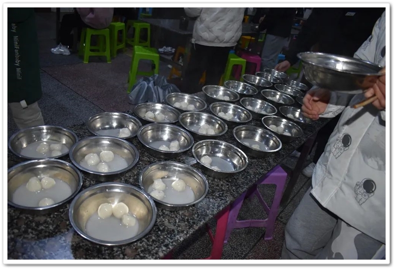 日常“一日四餐”的夜宵,今晚自然是应景的汤圆。现在的孩子不缺吃食,原本平平无奇的一碗汤圆,因着元宵节的氛围,却令孩子们充满了期待与欣喜。准高一、高一、高二、高三今晚特意将夜宵安排在晚自习的课间休息时间。晚上9点20,第二节晚自习下课铃一响,灯火通明的间间教室响起阵阵不约而同的欢呼,孩子们雀跃着涌进食堂。圆鼓鼓的汤圆恰逢其时,热气腾腾摆放在每个班级餐桌案头,一班一盆,班长掌勺,饭量随缘,吃完再舀,不够再添。