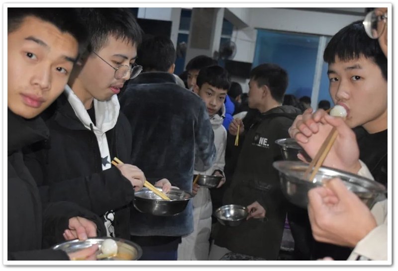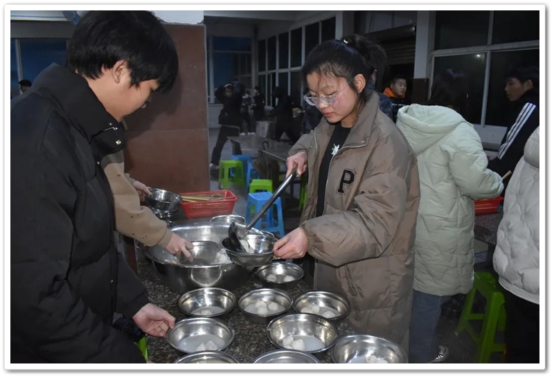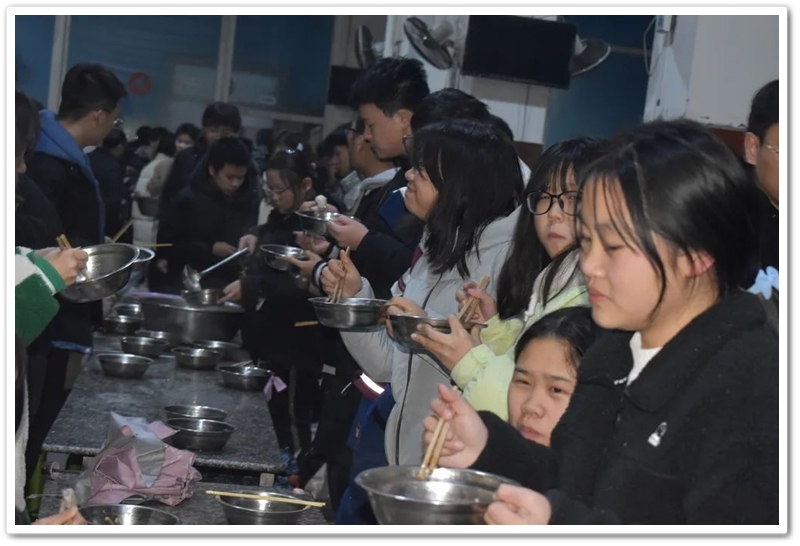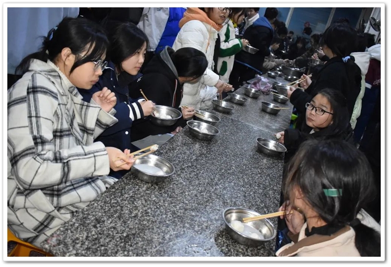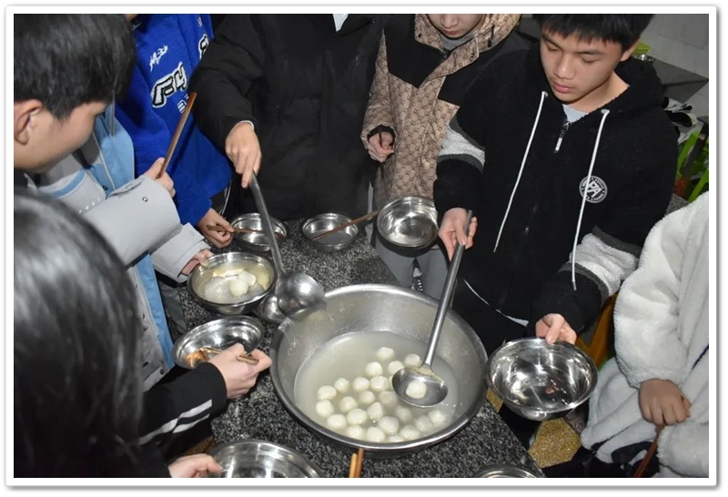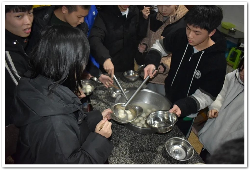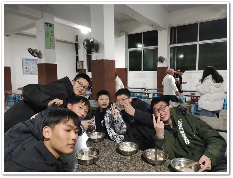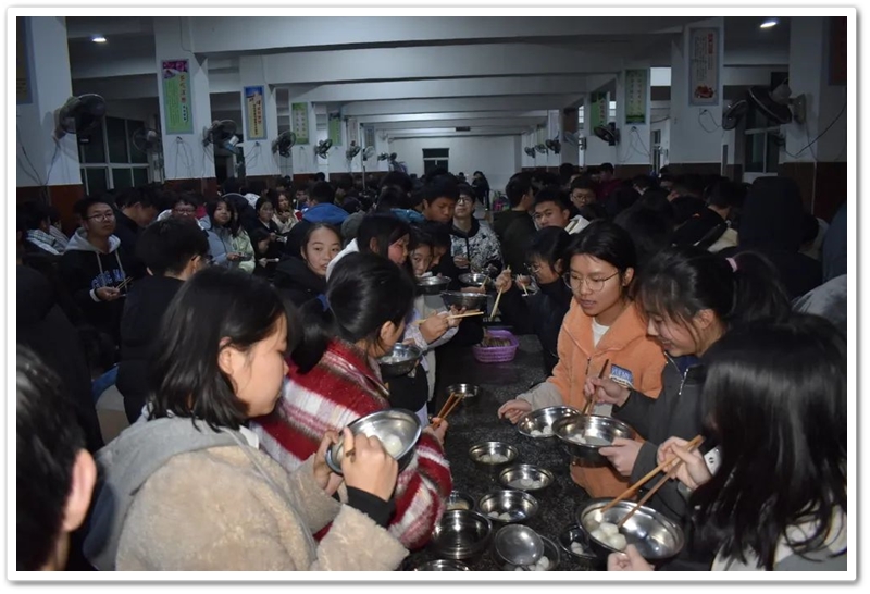 出教室、进食堂、舀汤圆、互致问候、开吃……元宵的快乐一气呵成,须臾的嘻哈喧闹过后,同学们又匆匆步出食堂,雀跃着奔回灯火璀璨的教学楼,他们还要上第三节晚自习。