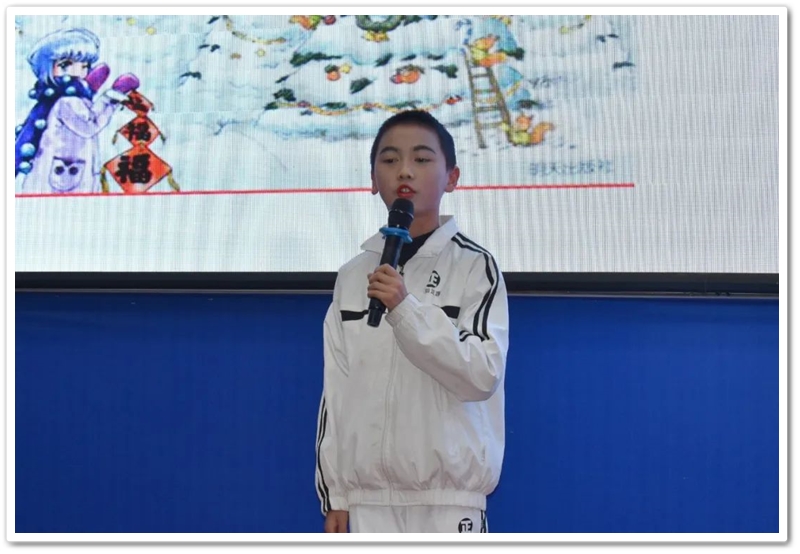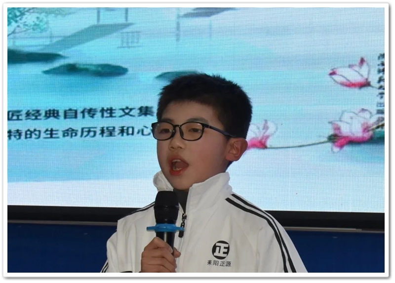 第三位上场的是360班的王曦博同学,他分享的书籍是来自杨红樱的系列丛书《笑猫日记之小猫出生在秘密山洞》。他一出场就用落落大方的仪态赢得同学们的瞩目。他用这本书告诉同学们:母爱是伟大的,我们在关心爱护猫妈妈的同时,也要明白妈妈养育我们的艰辛,做一个孝顺的孩子。