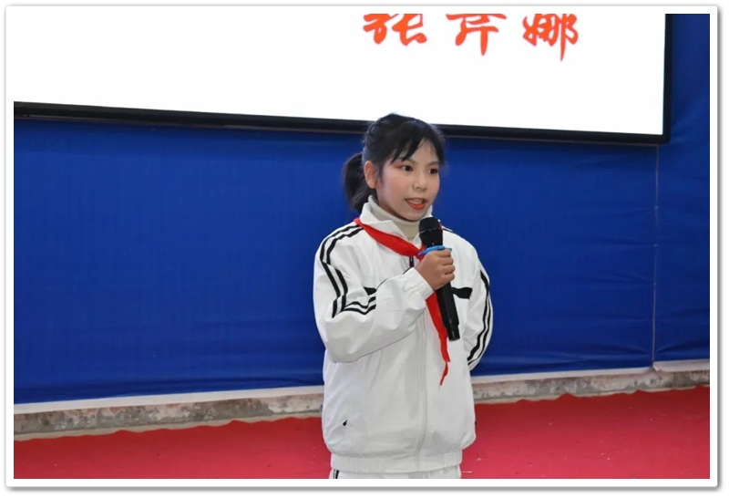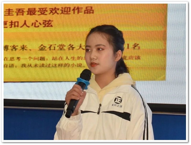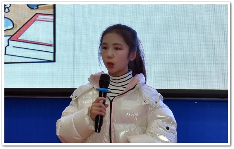 第二位上场的是356班的张芹娜同学,她为大家分享的是桂文亚的作品《班长下台》。这本书介绍了作者童年点点滴滴经历,告诉大家:作为一个班长,要有所担当,要乐于助人,要做同学们的好榜样。