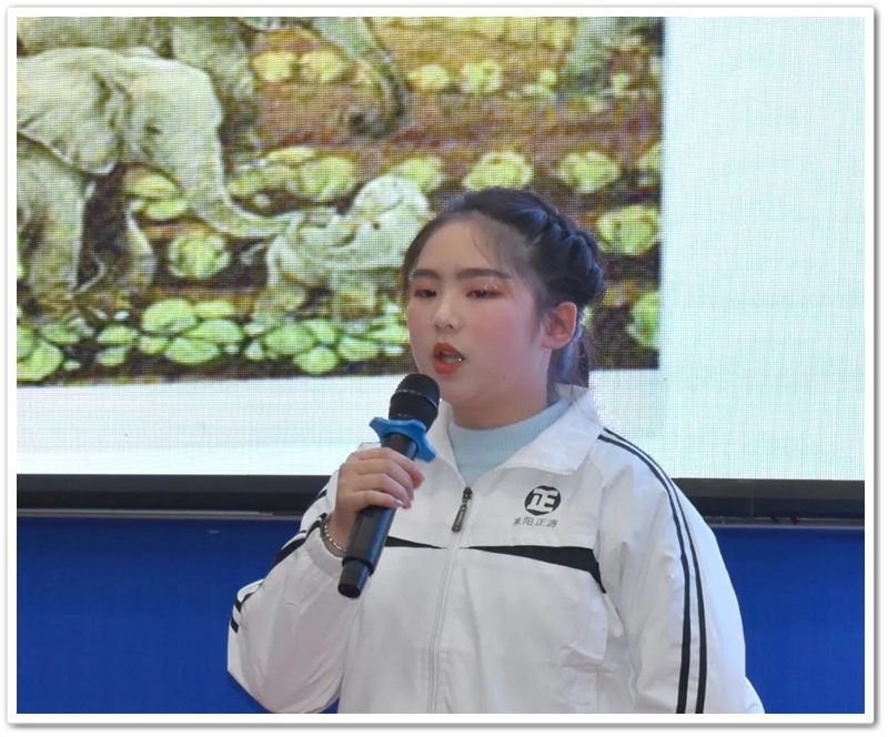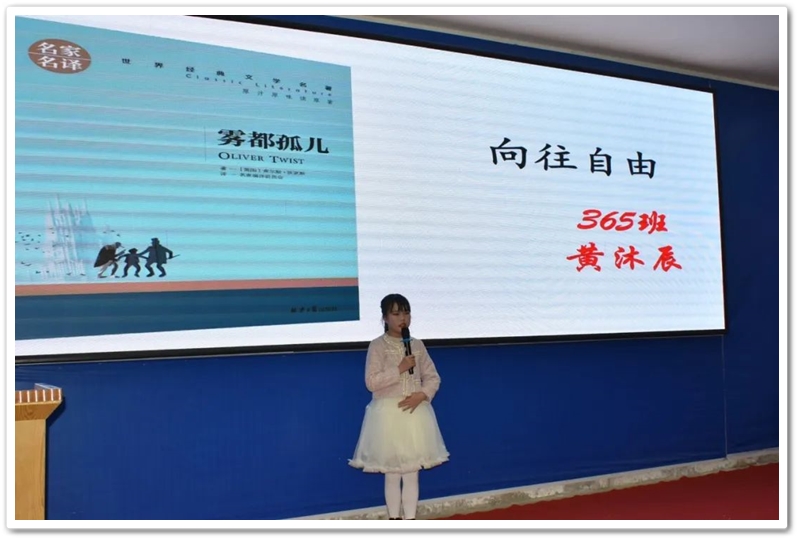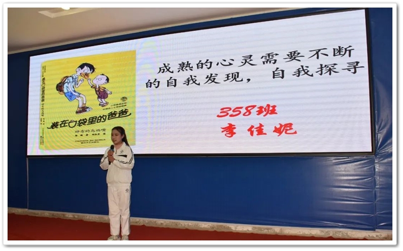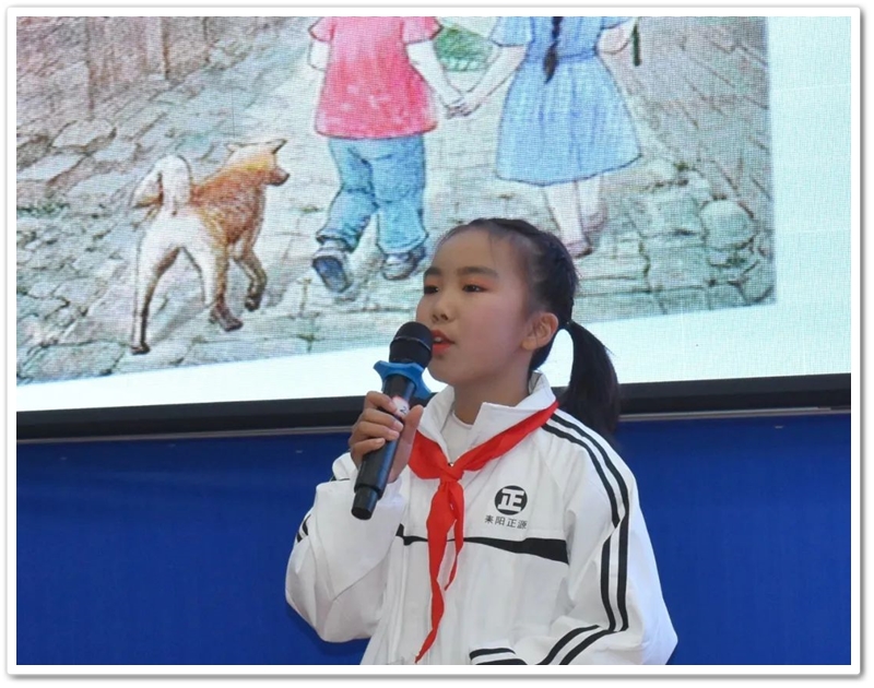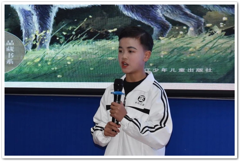 瞧,357班的谭浩轩带着他的爱书《狼王梦》走上舞台了,他是一个羞涩的孩子,此时却在舞台上侃侃而谈。在他的讲述中,故事情节一环扣一环,让听者意犹未尽。同学们知道了:大自然中狼的母爱同样伟大。