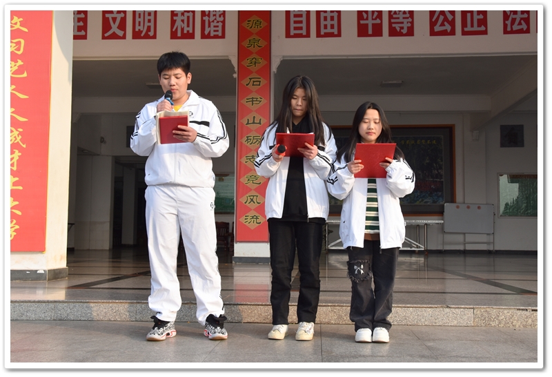 升旗仪式上,高一年级德育主任黄黄宜军发表主题讲话《一缕阳光一滴水,一粒粮食一颗钉——学习雷锋精神,我们永远在路上》。表扬李君昊等4位同学拾金不昧高尚品德的同时,黄主任叮嘱同学们积极向上锐意进取,从身边小事做起,珍惜每一粒粮食、每一滴水,认真听好每一堂课,怀着感恩之心为父母做力所能及的事,让雷锋精神融入日常、成为经常,以新时代好青年的担当传承雷锋精神,在平凡的岗位上创造不平凡的价值。