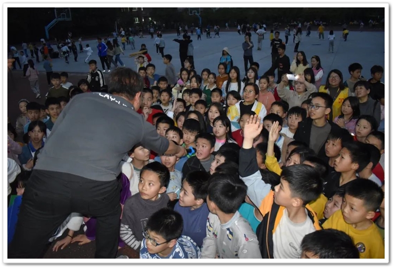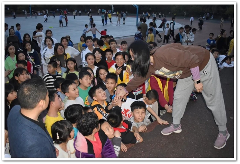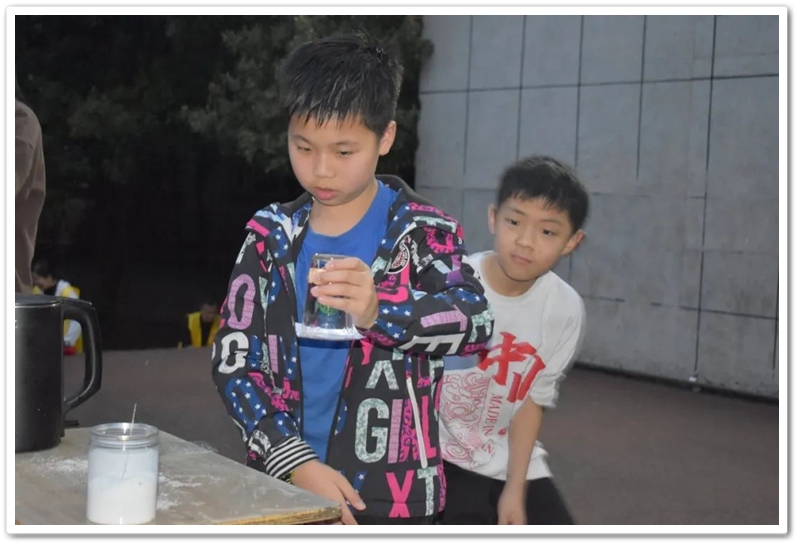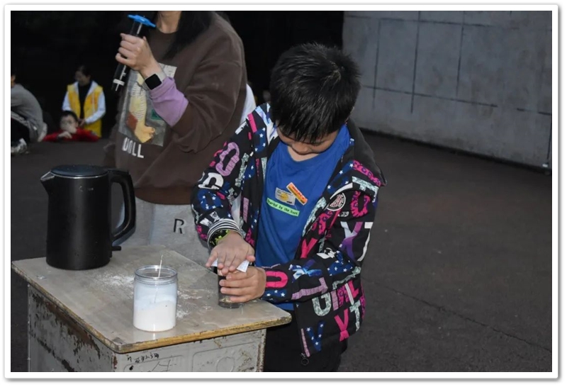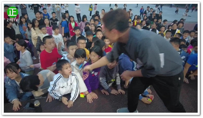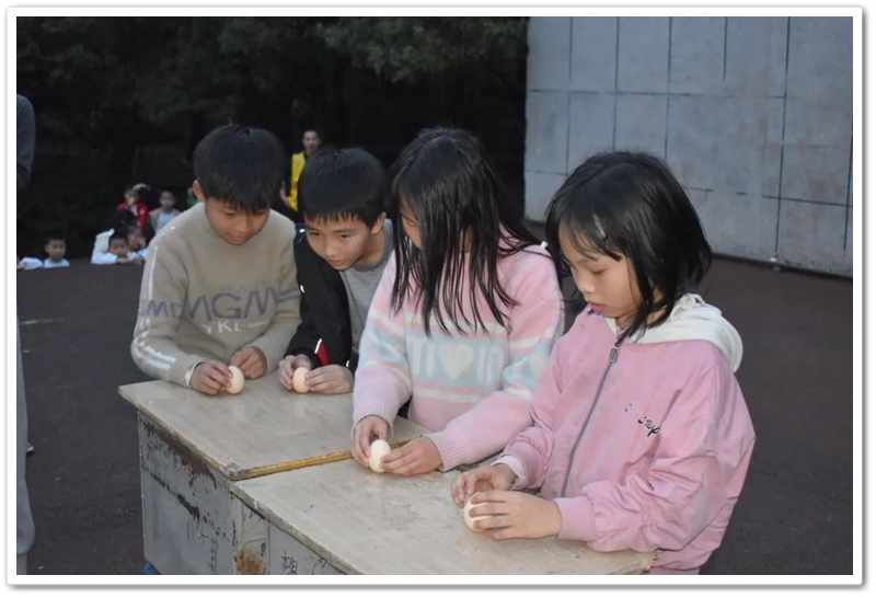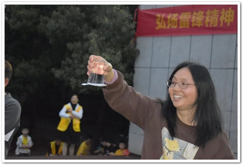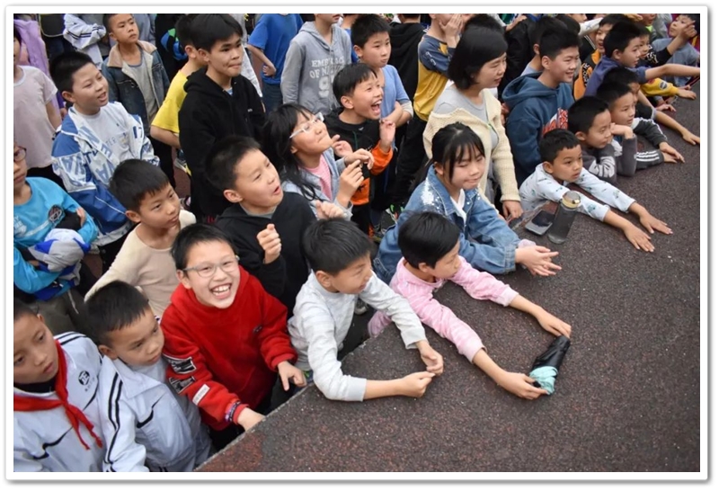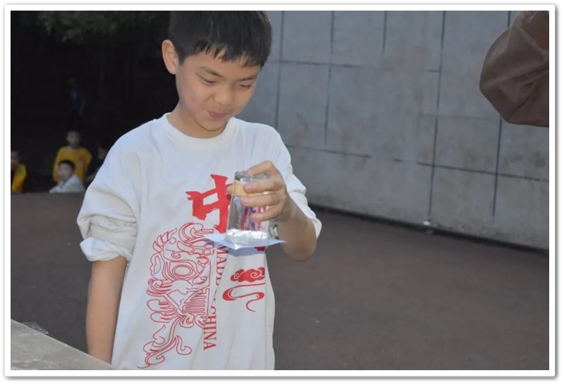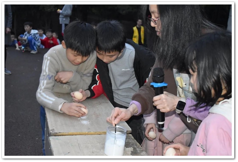 接下来就到了第三环节:科学小课堂。这一环节由五年级专职科学老师伍秀兰老师带来两个小实验“竖鸡蛋”、“倒扣水杯”。伍老师手提两个袋子,一上场就受到学生的欢迎,很多学生恨不得立马上台来参与实验。只见伍老师从袋中拿出鸡蛋,台下的观众一片欢呼,“炒鸡蛋,炒鸡蛋了”,他们没想到的是“竖鸡蛋”。伍老师先请几位同学上台试验,在光滑的课桌上立鸡蛋,无论孩子们多么小心翼翼都无法将鸡蛋立起来,这个时候,台下的孩子们就发出了疑问:鸡蛋能立起来吗?也有的同学说道:“加盐、加点盐。”果不其然,在伍老师给桌面加了一点盐之后,鸡蛋真的神奇般的立起来了,于是伍老师又紧接着给孩子们解释这一科学小道理,孩子们听得可认真了。第二个实验是倒扣水杯,这个孩子们基本上都会,都能操作成功。伍老师“炫”的这两个小小实验,相信已经“炫”出了孩子心中的科学梦!