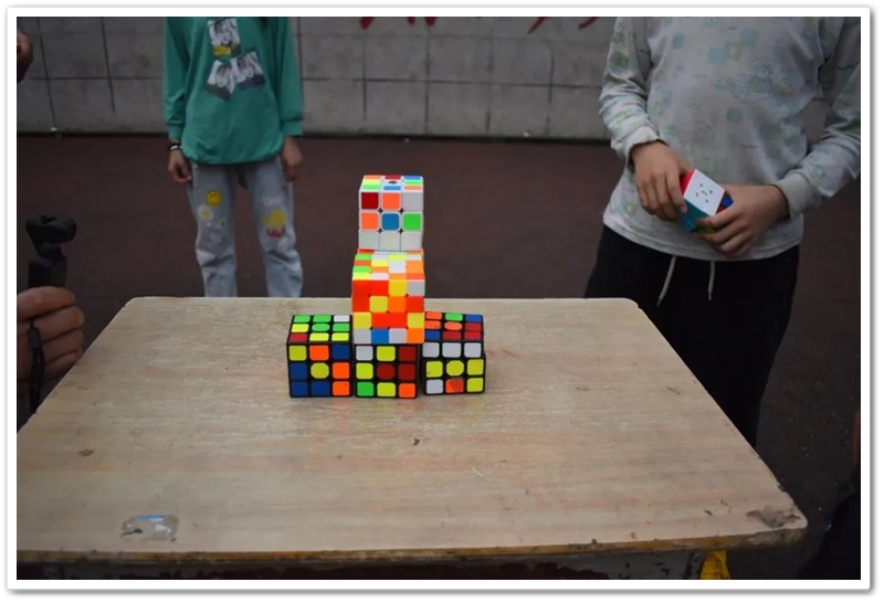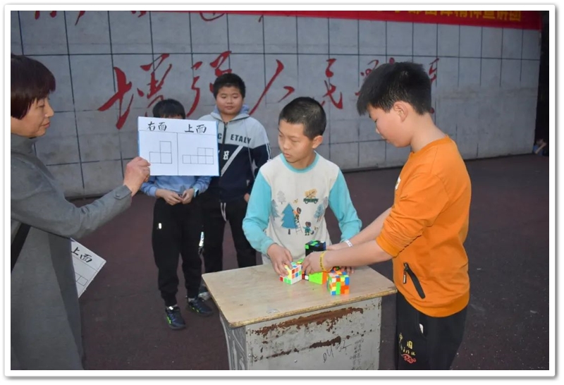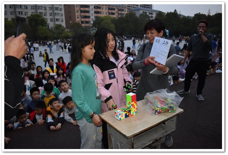 第一环节结束了,还有很多学生意犹未尽,这不,第二环节用魔方摆图形马上登场。本环节,学生2人一组,根据给出的两视图,摆出符合要求的立体图形。这一环节不仅可以训练孩子们的空间思维能力,也能让孩子们体会合作学习带来的成就感。孩子们在台上摆,观众在场下喊,自发当起了评委,就这样,一组,两组......孩子们尽情在舞台上散发魅力。