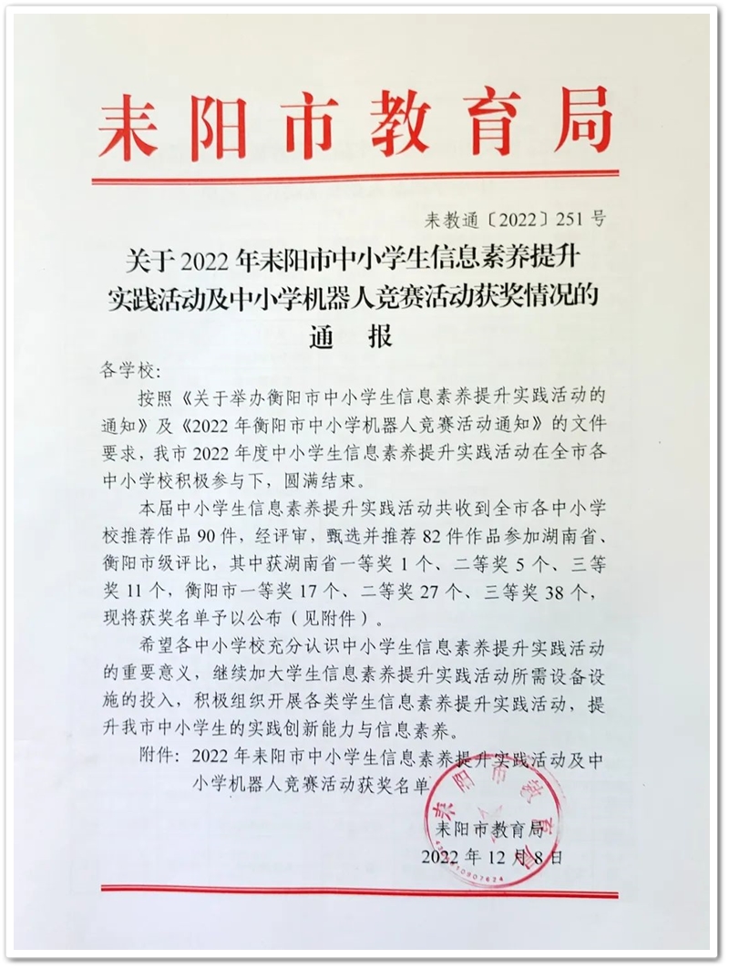 喜报!初春三月,草长莺飞,花红柳绿,我校学生在“2022年衡阳市中小学生信息素养提升实践活动暨2022年衡阳市中小学机器人竞赛”中积极参与,斩获佳绩。