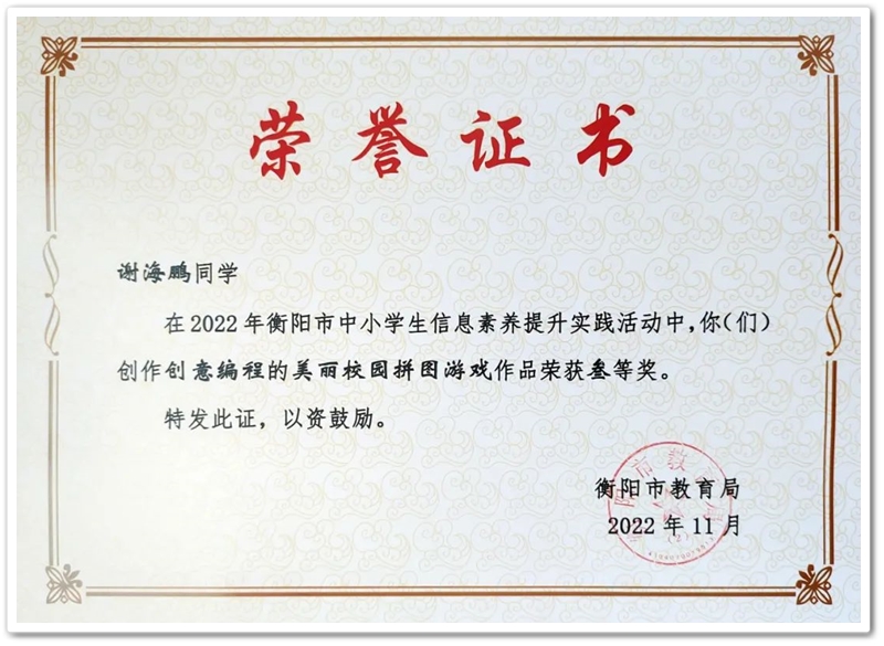 2022年4月,在收到《2022年衡阳市中小学生信息素养提升实践活动暨2022年衡阳市中小学机器人竞赛活动的通知》后,我校信息技术老师利用上信息技术课的时间在全校一万多名学生中筛选出十多位种子学生选手,然后利用个人休息时间(午饭后晚饭后)进行课后辅导,花费了一个多月时间积极准备,最终选定了十多篇作品参加此次大赛。“宝剑锋从磨砺出,梅花香自苦寒来”,本次竞赛,硕果累累,获奖率高达80%。
