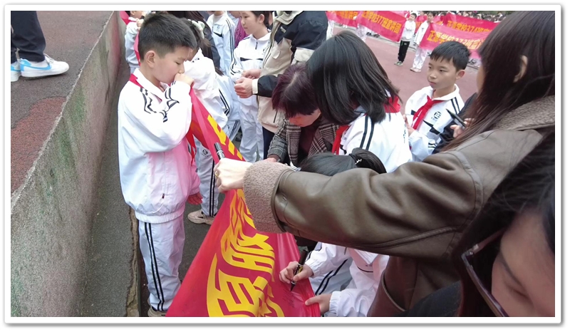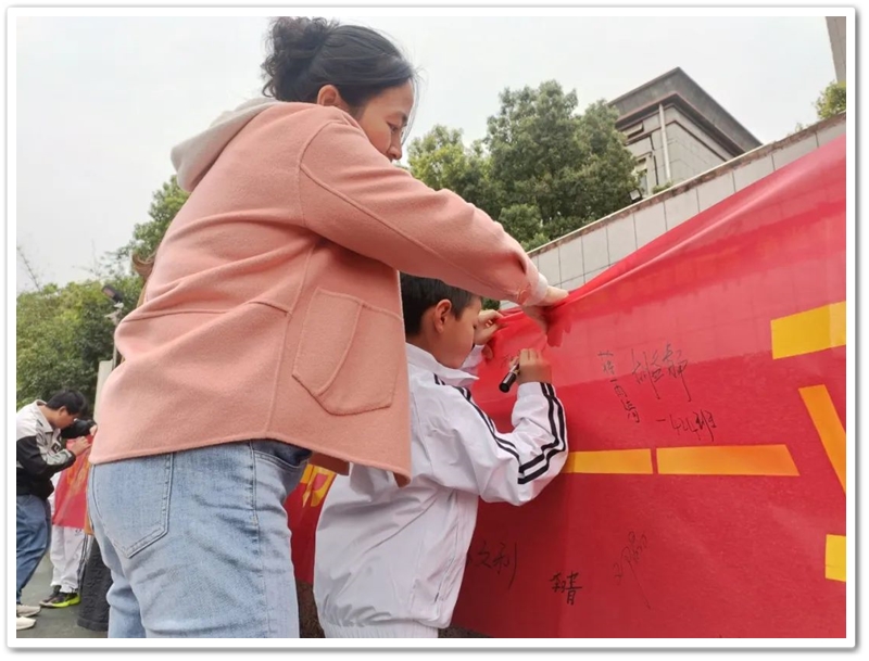 宣誓结束后,在小学部罗俊豪主任、罗林珂老师的带领下,全体师生在横幅上签名。