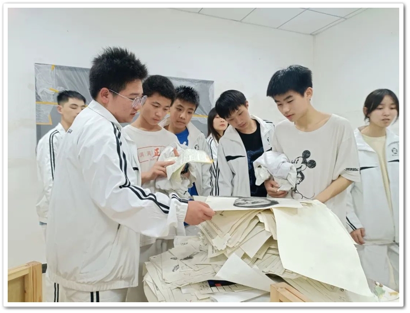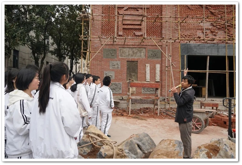 早餐后,米勋老师带领同学们参观正在紧锣密鼓建设中的美术大楼和学校现有的古迹收藏。米老师湖南师范大学美术学专业硕士研究生毕业,18年一线高考教学经验。他向同学们介绍,现在建设中的美术楼,规划为三层,一楼为约2000平的美术博物馆,同时配有名师个人工作室。二楼设有报告大厅,二、三楼小班美术教室共30余间,同学们参观时感觉大得也像迷宫。同学们看到,美术大楼正面红砖裸墙上,是特殊设计的立体字画,左边是竖排“正源教育”四个大字,右边是横幅“千里江山图”,这些字画造型别致,大气磅礴。字画下面墙体上,镶嵌着大小不一、年代各异的石碑,朴实无华,古色古风。