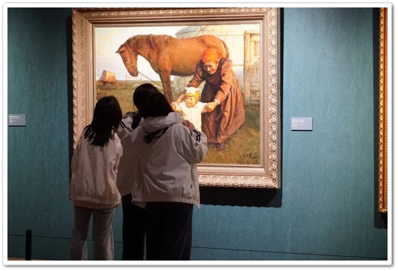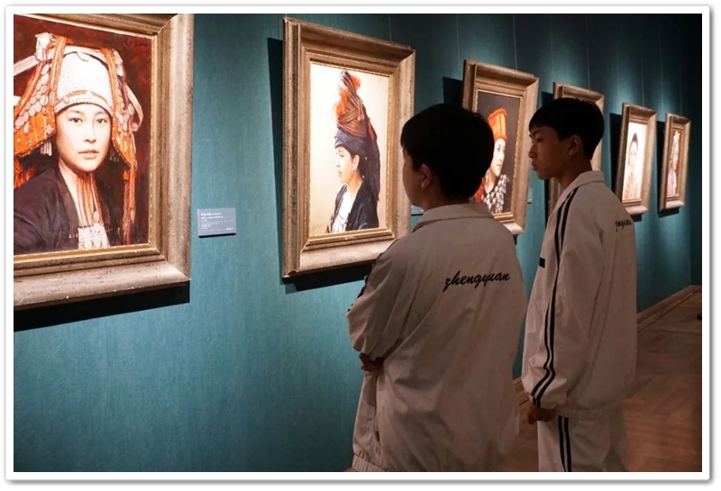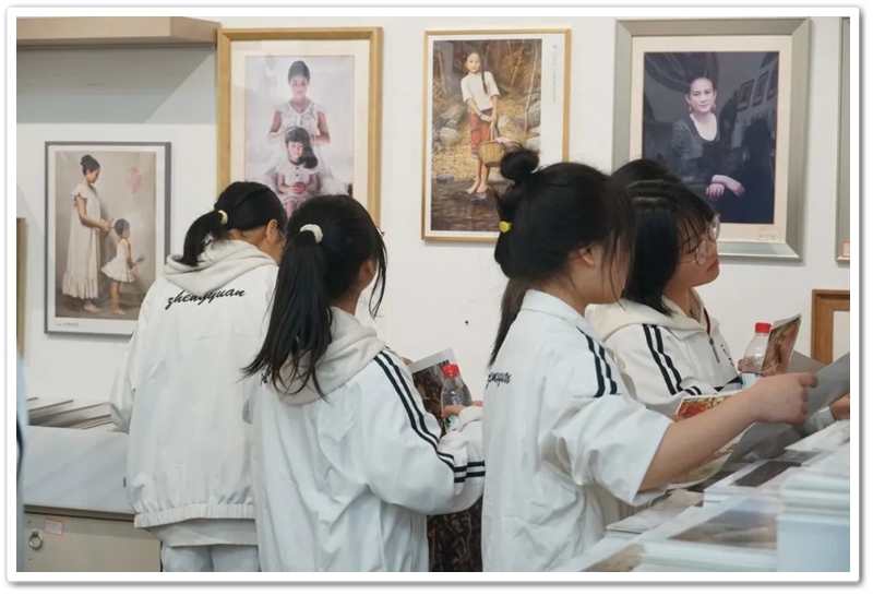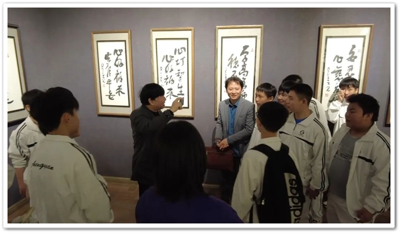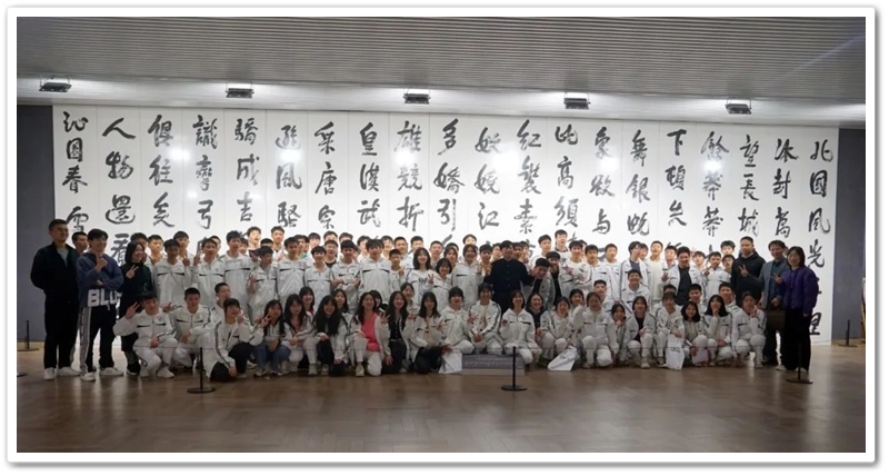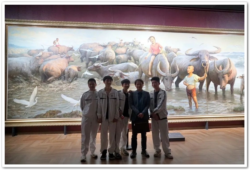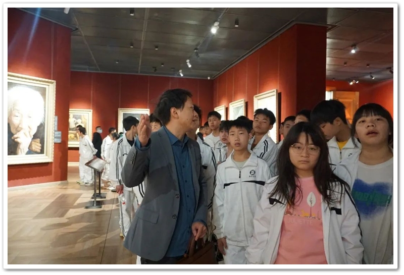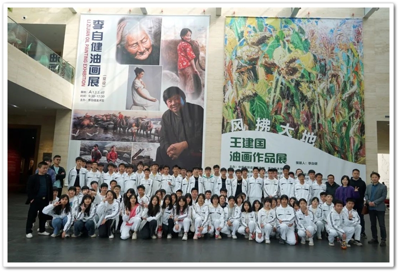 接着,同学们再乘大巴前往位于湘江西岸的李自健美术馆。这是世界上最大的个人美术馆。更幸运的是美术馆馆长李自健先生今日在美术馆内,看到正源学校这么庞大的学生队伍前来参观,非常高兴,放下手中忙碌的活计,亲自给同学们当向导,当讲解员。当讲解到受台湾星云大师委托所创作的《南京大屠杀》油画前时,同学们深受震撼,黄磊同学说,原来自己只懵懵懂懂地想学书法,现在像醍醐灌顶,当时就明确了自己的奋斗目标,也要像李自健老师一样拿起画笔,揭露日本军国主义的罪行,呼吁人们珍爱和平,反对战争。