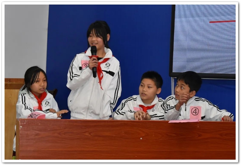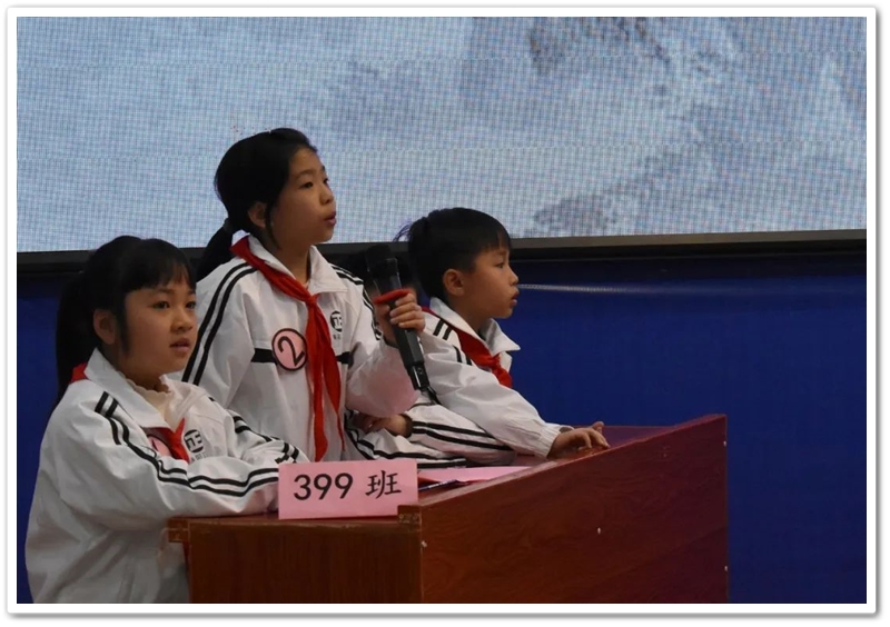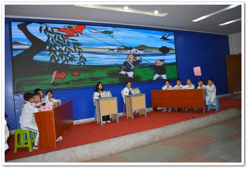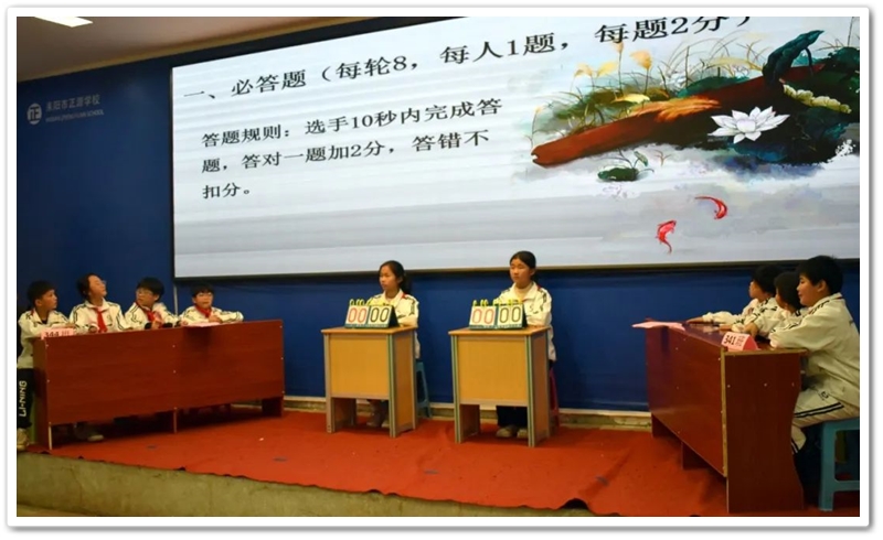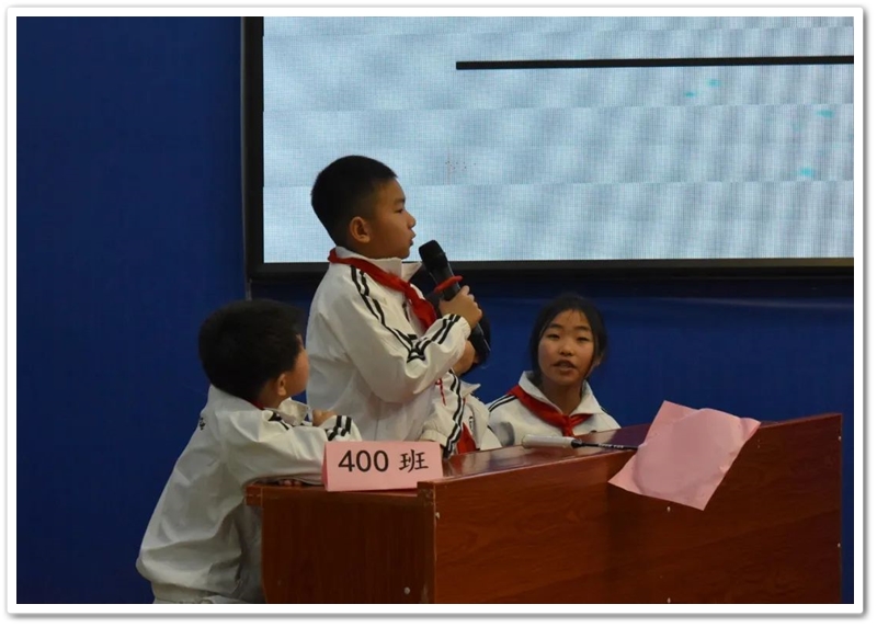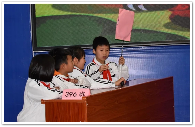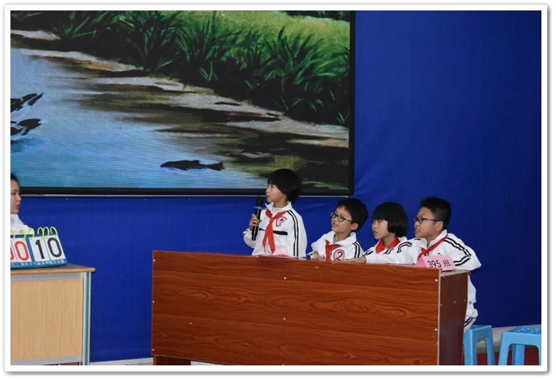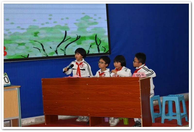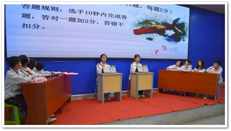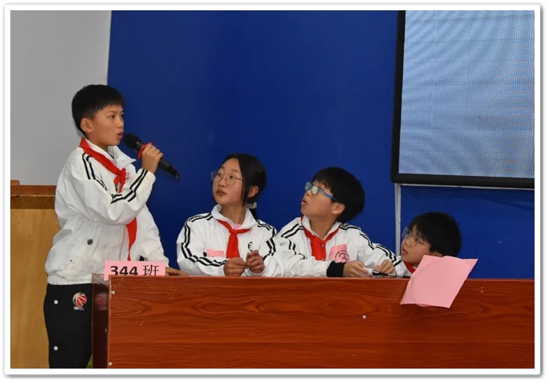 比赛首先是六年级各班级派出的四位高手的追逐赛。343班对阵344班,341班对阵342班。选手们或气定神闲,或淡定自若,一副胸有成竹的样子。比赛各个环在有序推进:个人必答题,团队抢答题,选择题,翻译题......你追我赶,随着比分的节节攀升,观众的心也随之揪了起来。最终,341班的四位同学具备超强的心理素质和丰富知识储备,一路过关斩将,获得比赛第一名。