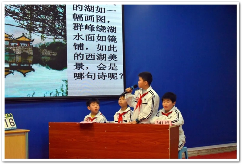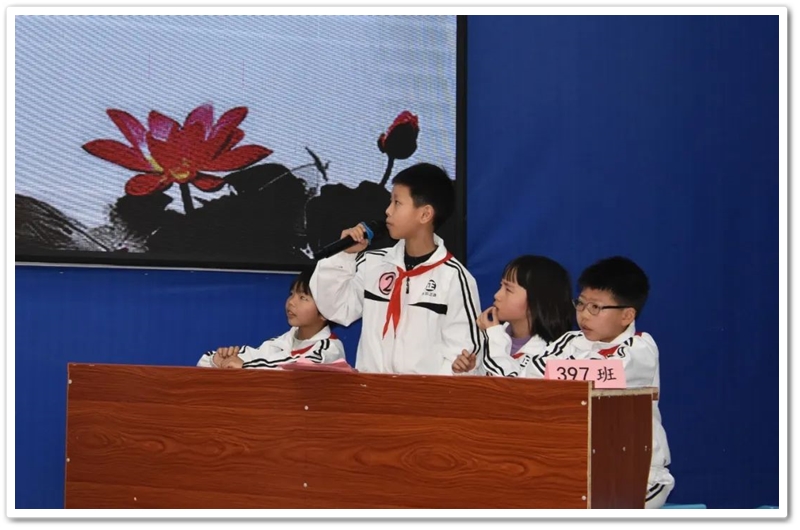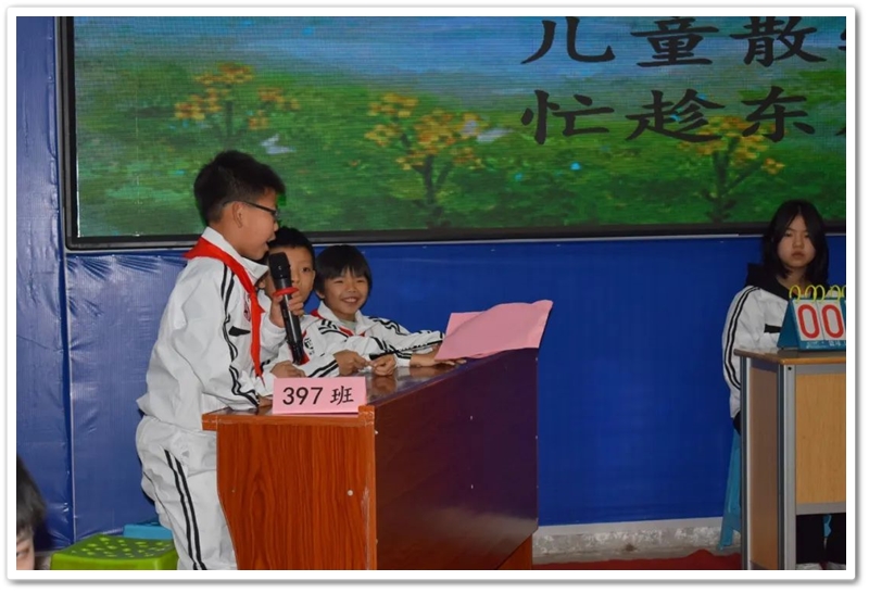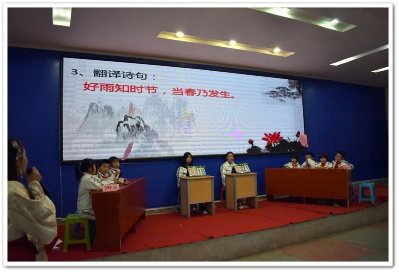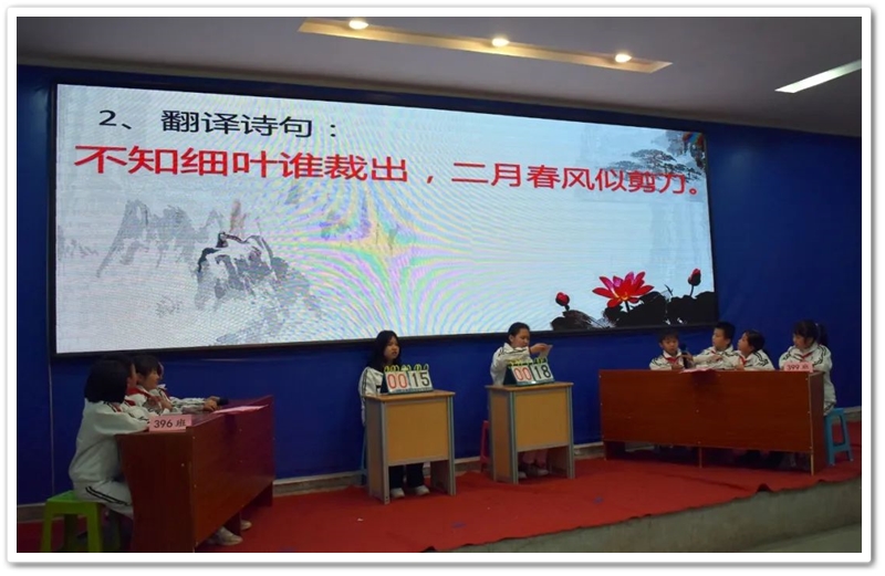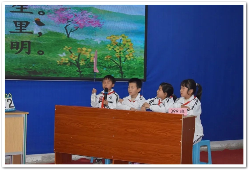 紧接着,三年级的小同学们上场了。别看他们年级不大,答起题来照样不差分毫。先一轮对战的是399班和396班,张若虚的《春江花月夜》、韩愈的《早春呈水部张十八员外》等等一些耳熟能详的诗句,孩子们张口就来,如数家珍。出色的表现换来了评委老师的高分回应。然而,人有失足,马有失蹄,一向被大家看好的398竟然在一道相对简单的翻译题上挫败。于是,对手397成功晋级下一轮比赛。