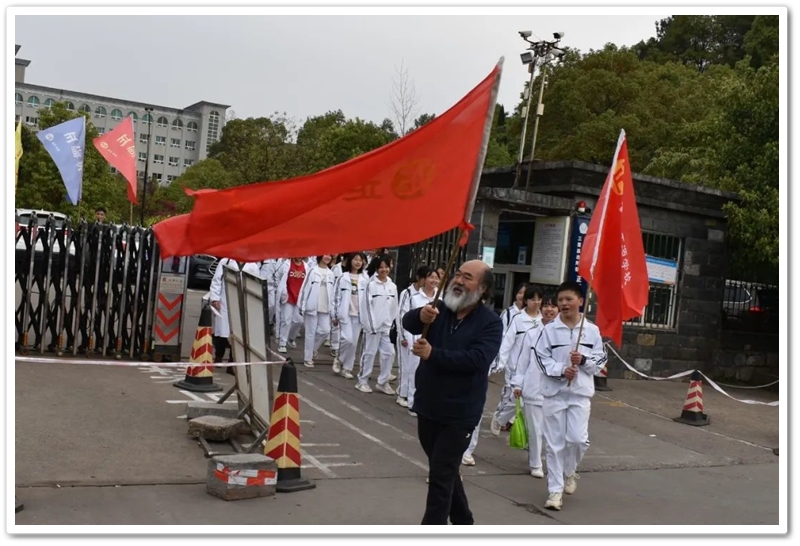“出发!”罗校长兴致勃勃地从C523班的旗手中接过校旗,领队起航。