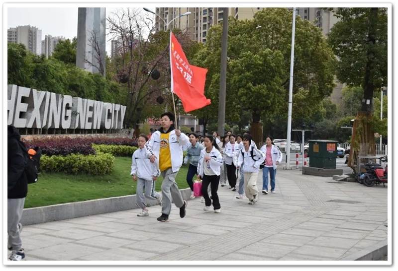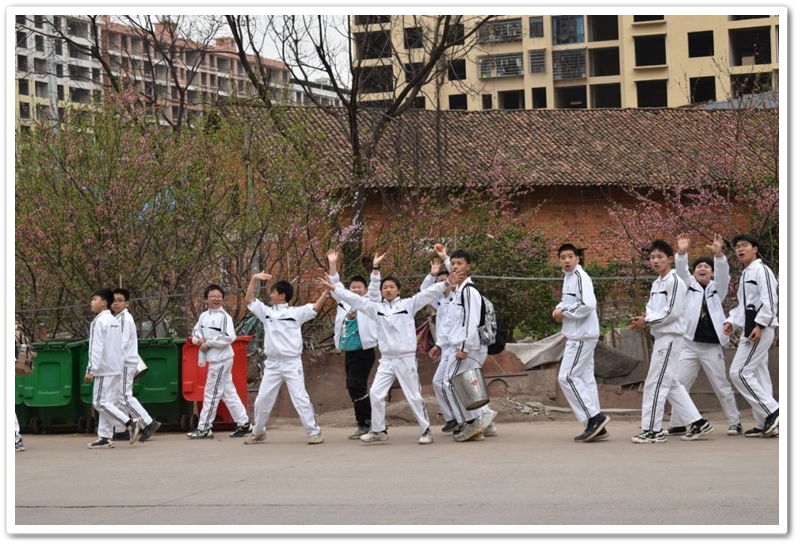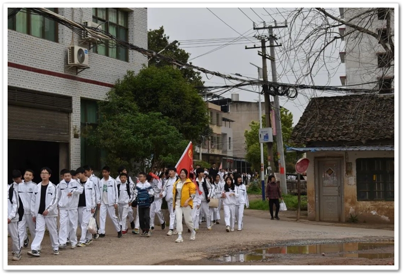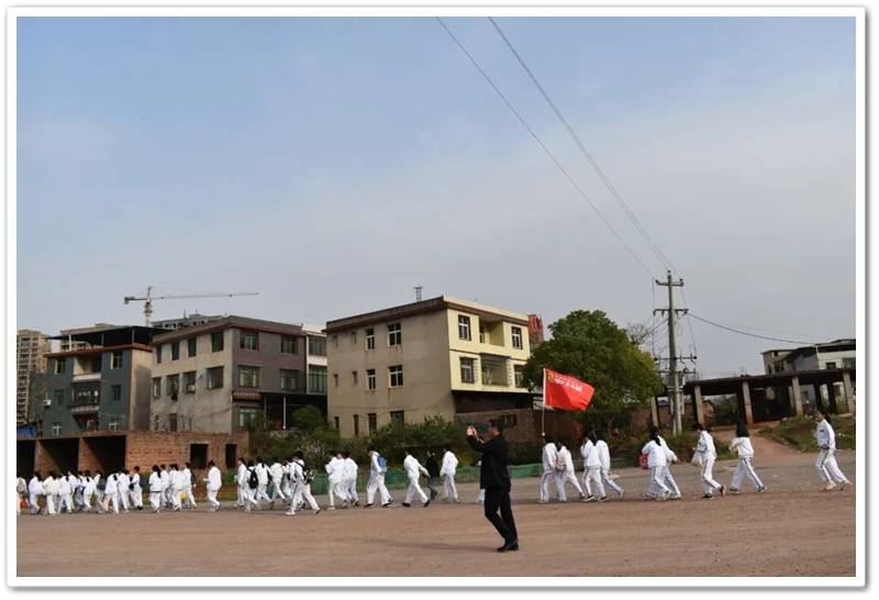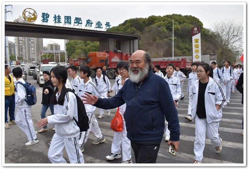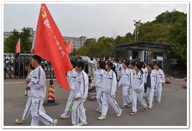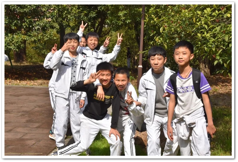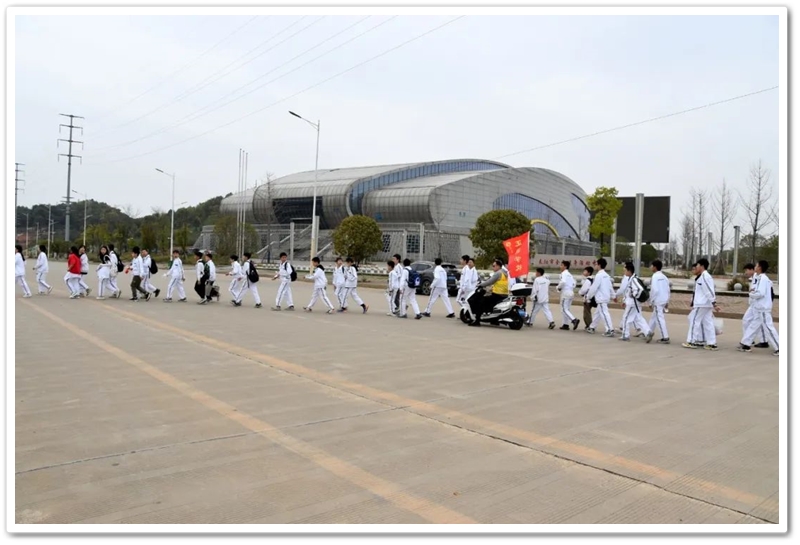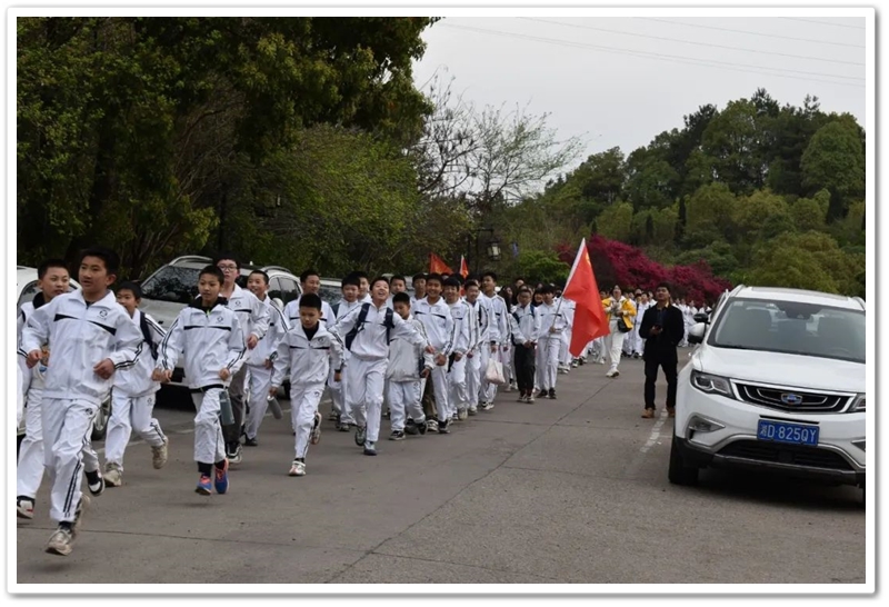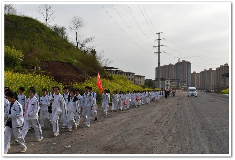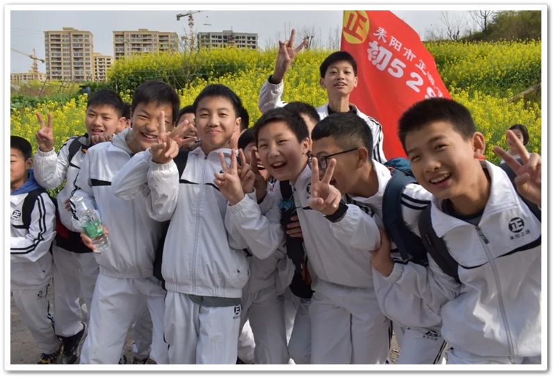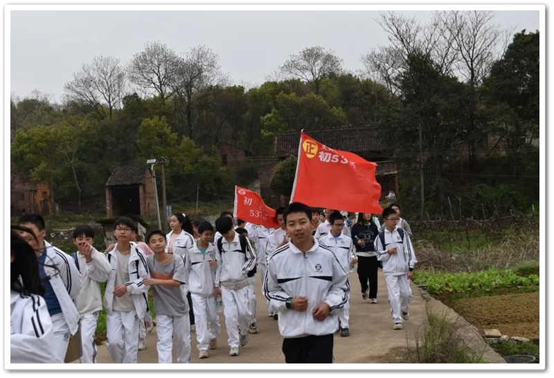孩子们的笑容也犹如这天气一般明朗,欢呼声一阵高过一阵。瞧,每班的旗手神态认真而欢快,队伍随着高高飘扬的班旗兴高采烈地行进着。他们或齐声高歌,或背诵诗词。当踏入乡村小道时,大家触景生情,忍不住唱起了《走在乡间的小路上》。看到了农田中牛耕地时,又立即背诵起《野望》。欢歌笑语声、朗朗背诵声交织在一起,本来艰辛劳累的徒步行走变成了轻松有趣的娱乐。但无论何种形式的活动,步伐始终是铿锵有力而又整齐划一。高处俯瞰,白色校服犹如一根白色的飘带在轻盈地飞舞;远处眺望,长长的队伍就像行进中的部队,煞是壮观!