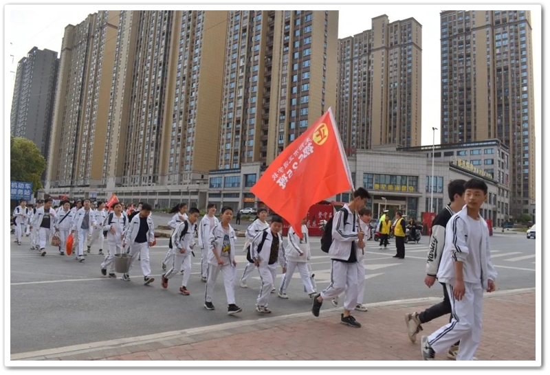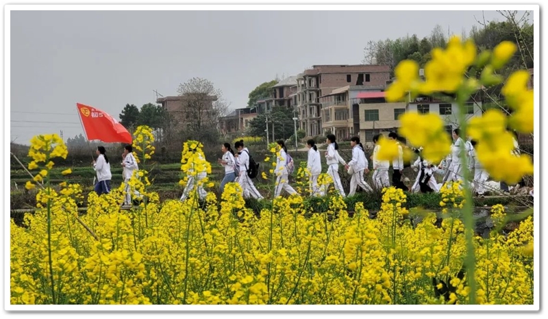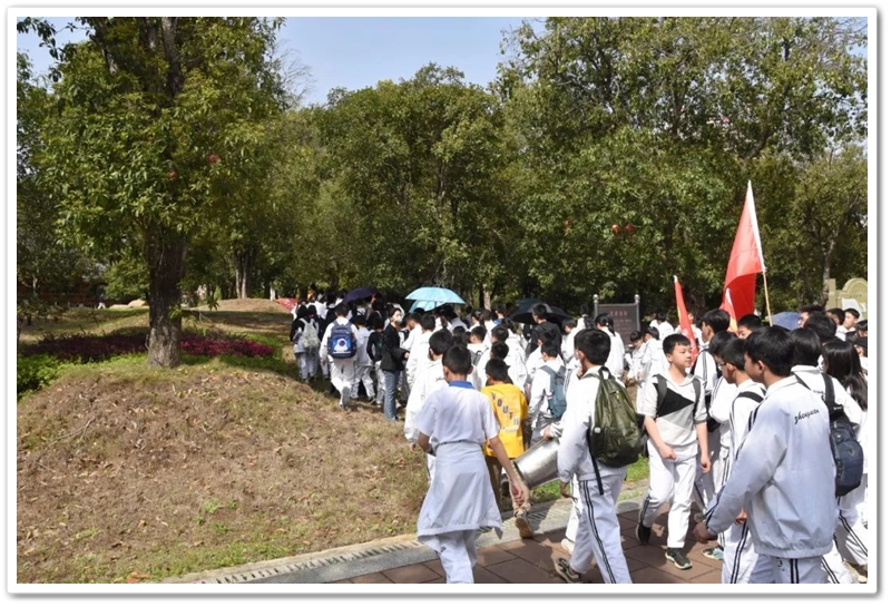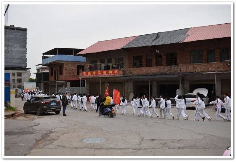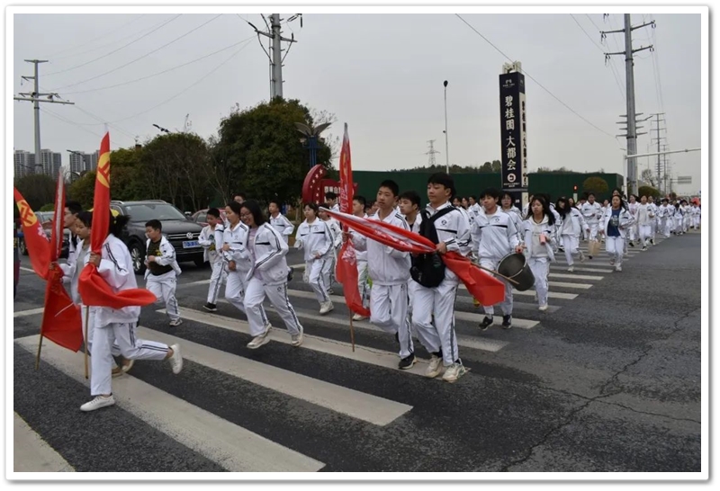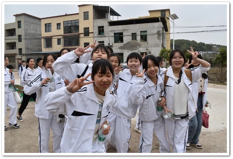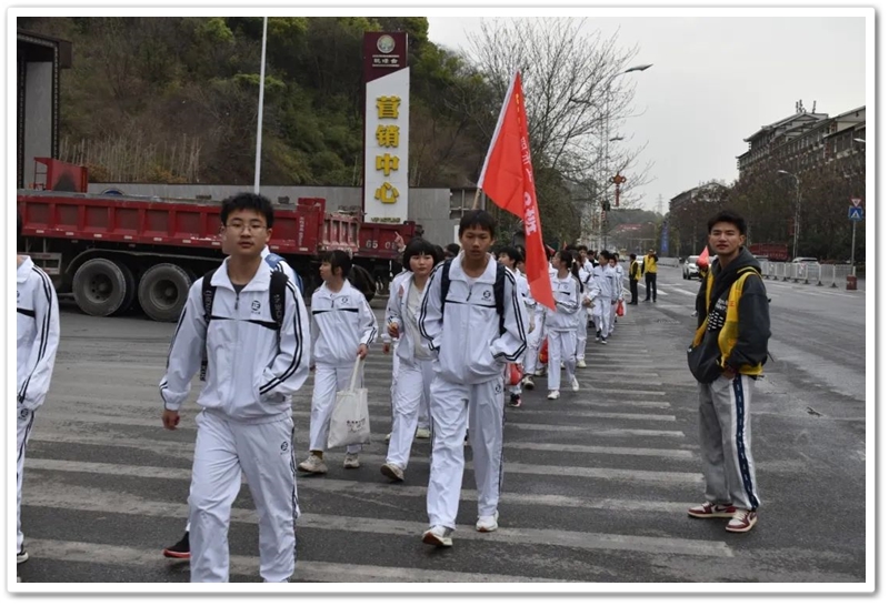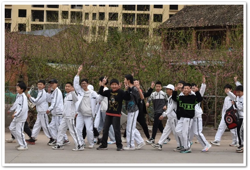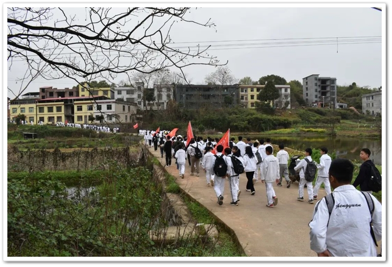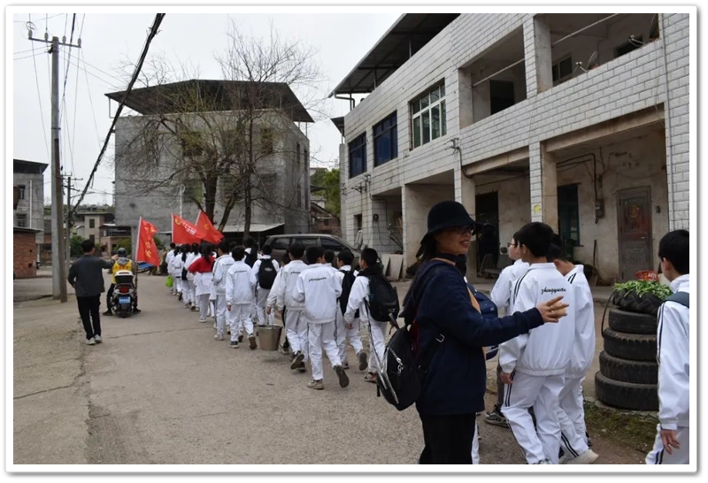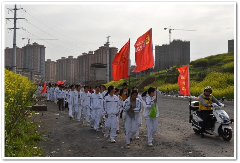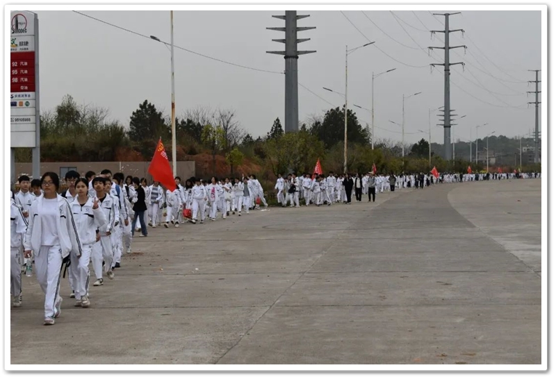 孩子们的笑容也犹如这天气一般明朗,欢呼声一阵高过一阵。瞧,每班的旗手神态认真而欢快,队伍随着高高飘扬的班旗兴高采烈地行进着。他们或齐声高歌,或背诵诗词。当踏入乡村小道时,大家触景生情,忍不住唱起了《走在乡间的小路上》。看到了农田中牛耕地时,又立即背诵起《野望》。欢歌笑语声、朗朗背诵声交织在一起,本来艰辛劳累的徒步行走变成了轻松有趣的娱乐。但无论何种形式的活动,步伐始终是铿锵有力而又整齐划一。高处俯瞰,白色校服犹如一根白色的飘带在轻盈地飞舞;远处眺望,长长的队伍就像行进中的部队,煞是壮观!