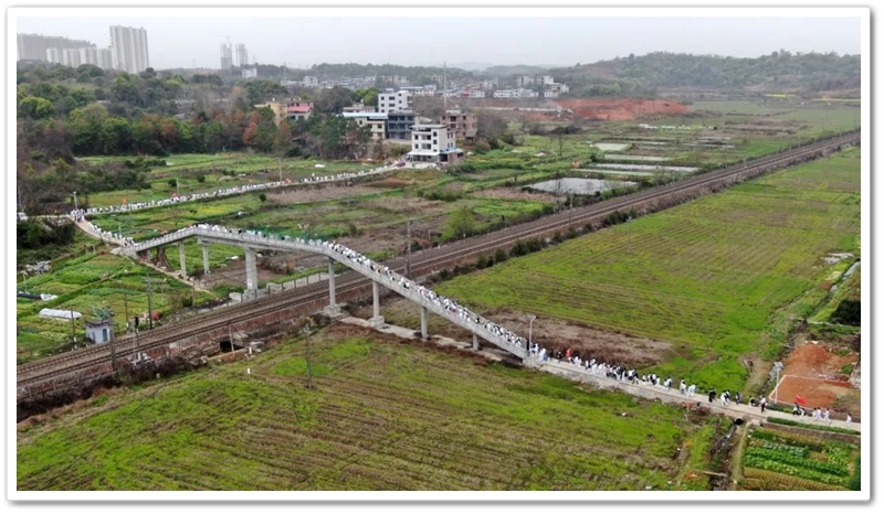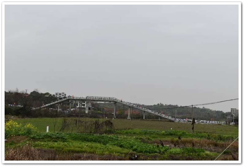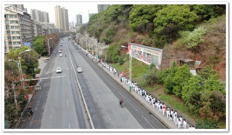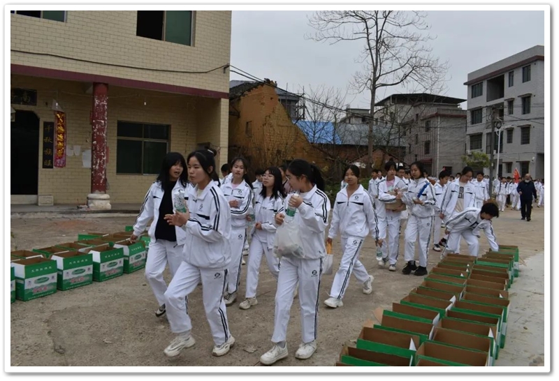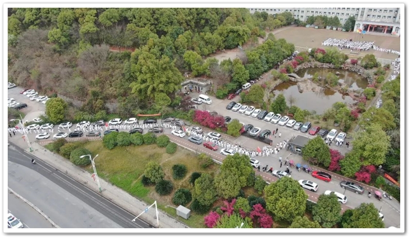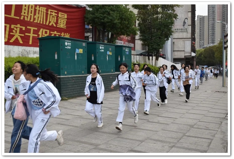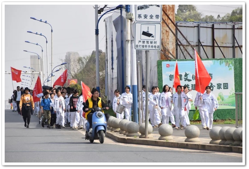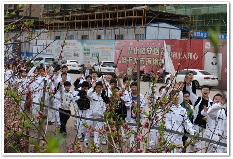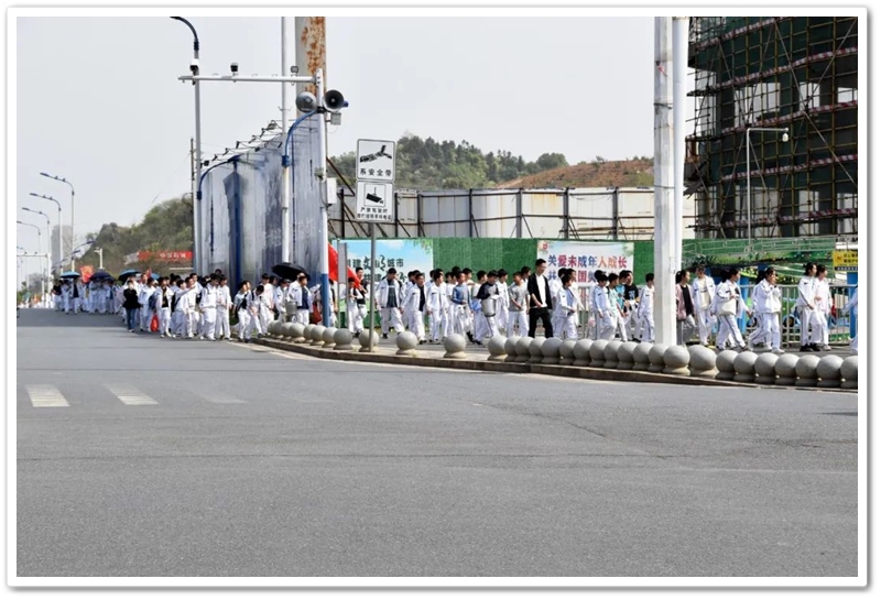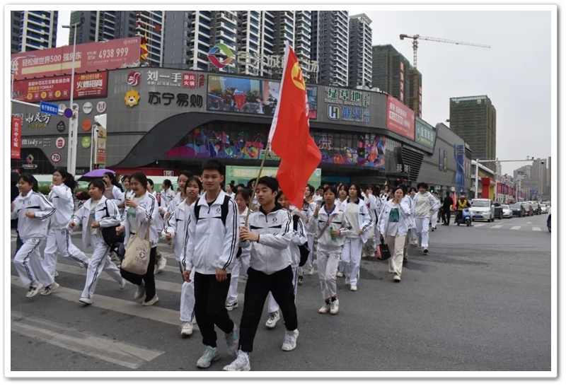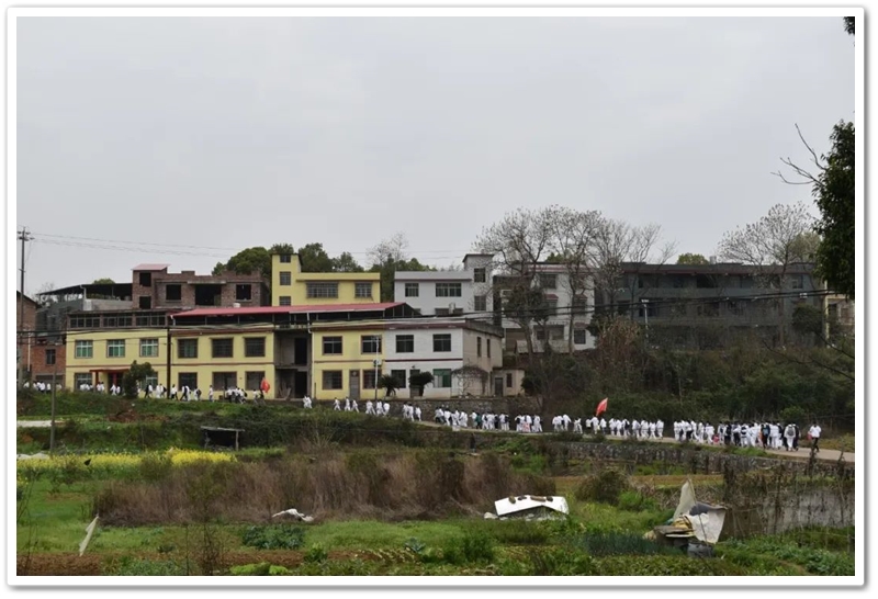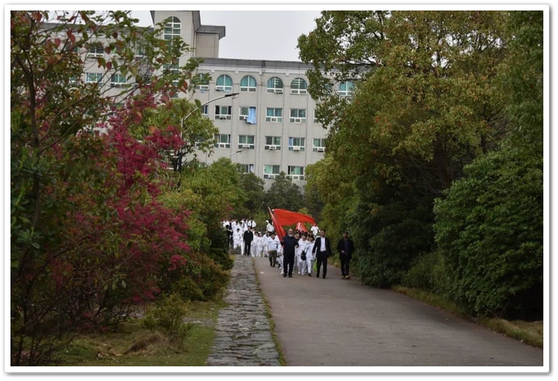 孩子们的笑容也犹如这天气一般明朗,欢呼声一阵高过一阵。瞧,每班的旗手神态认真而欢快,队伍随着高高飘扬的班旗兴高采烈地行进着。他们或齐声高歌,或背诵诗词。当踏入乡村小道时,大家触景生情,忍不住唱起了《走在乡间的小路上》。看到了农田中牛耕地时,又立即背诵起《野望》。欢歌笑语声、朗朗背诵声交织在一起,本来艰辛劳累的徒步行走变成了轻松有趣的娱乐。但无论何种形式的活动,步伐始终是铿锵有力而又整齐划一。高处俯瞰,白色校服犹如一根白色的飘带在轻盈地飞舞;远处眺望,长长的队伍就像行进中的部队,煞是壮观!