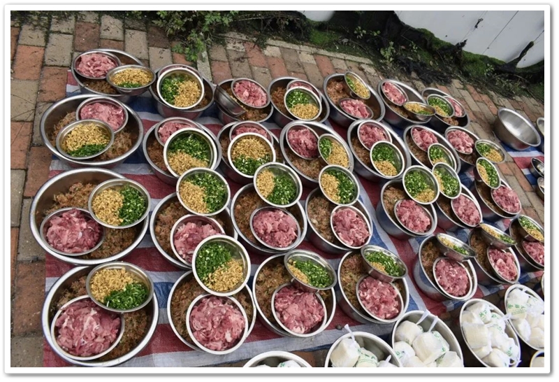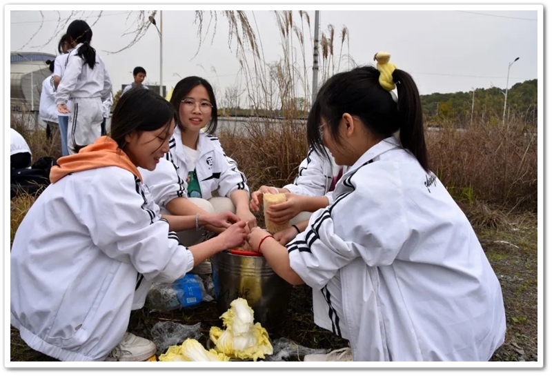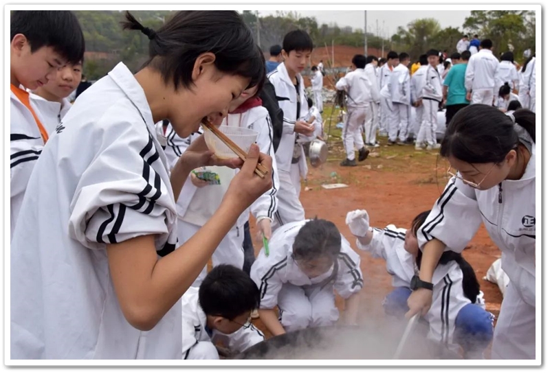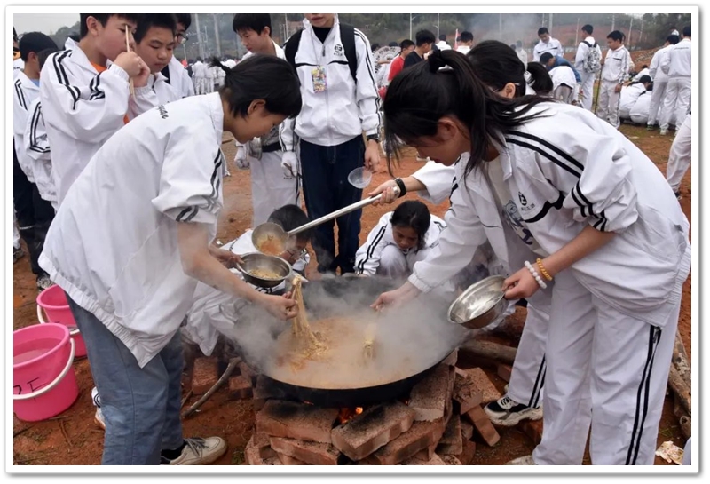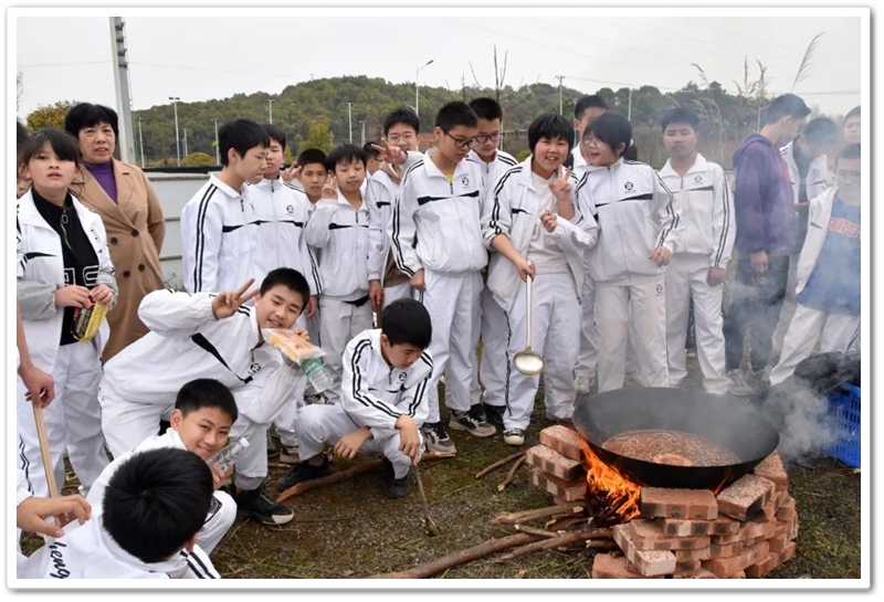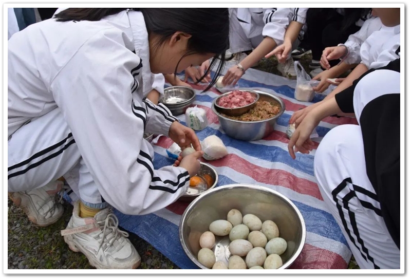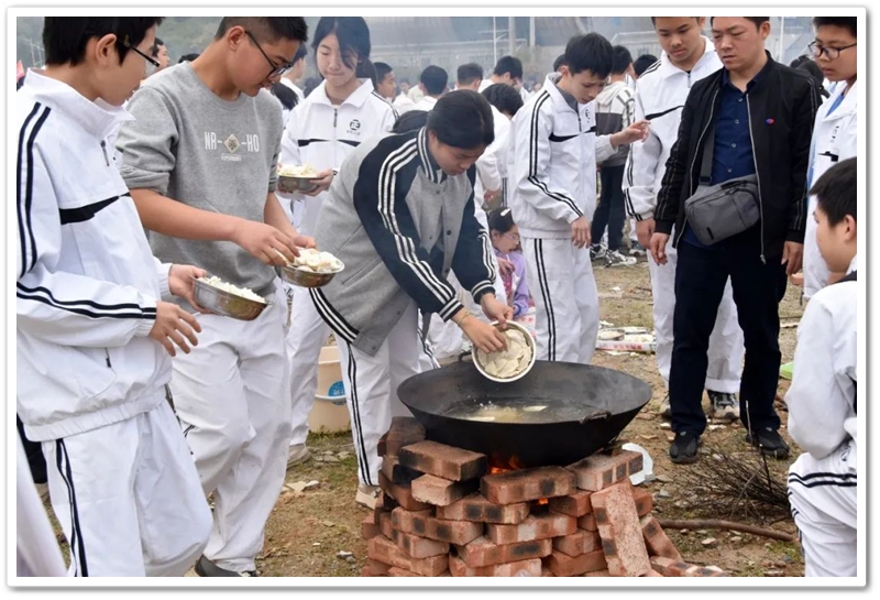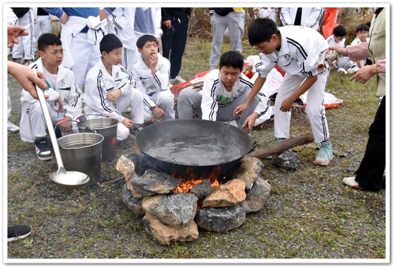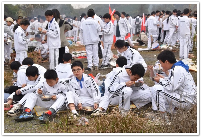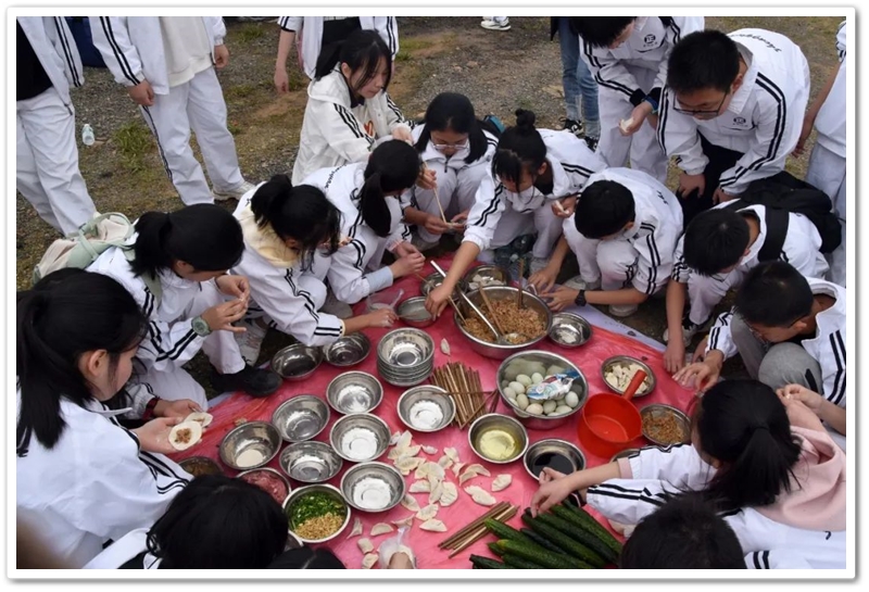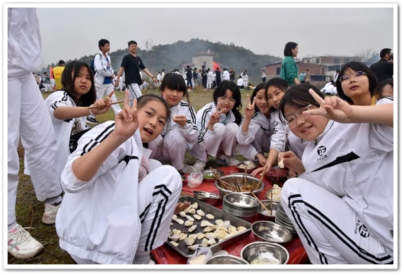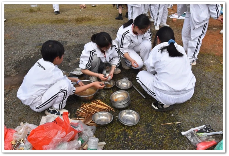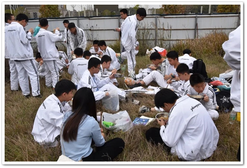 在大家的齐心协力下,约1个小时之后,面条、饺子陆续出锅。面条一出锅,登时香气四溢,所有人被它的香气所吸引,团团围在锅旁。香味钻入鼻中,嘴里不知不觉地流出口水来。嫩白剔透的面条中,火腿色泽明亮,其中夹杂着点点绿色。第一碗,肯定得先送给可亲可敬的罗校长,还有日夜为年级操劳的倪主任。面条入口,香绕心头,暖意袭卷全身,同学们脸上挂满了笑容,疲惫在野炊中消失得无影无踪。大家品尝着自己的劳动成果,心中有一种说不出来的幸福与自豪。