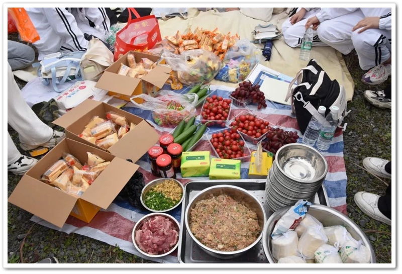 11:30,到达野炊点。之后,垒灶台、领食材、取水、生火、包饺子、下面条,每班在事先分好的组中有序地进行着各自的任务。各组之间分工合作,各成员间配合默契,没有谁掂轻怕重。一切都在紧张而有序地开展着。