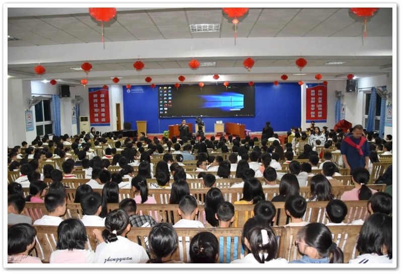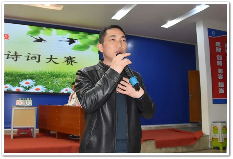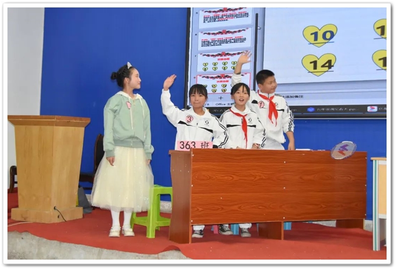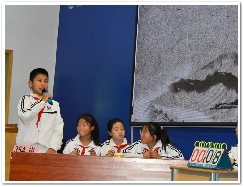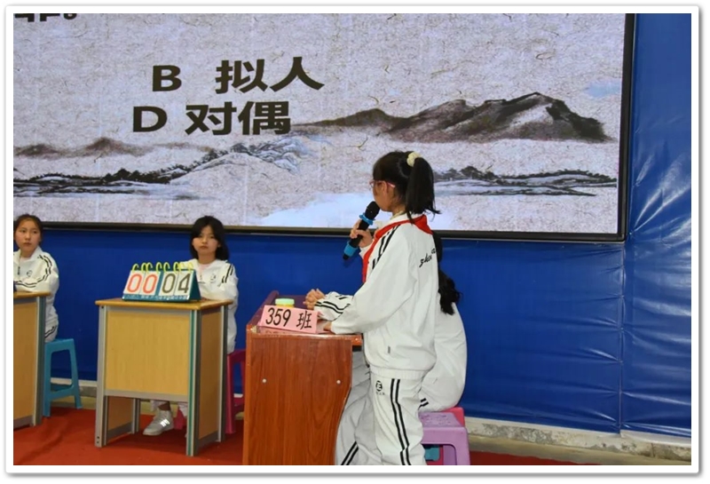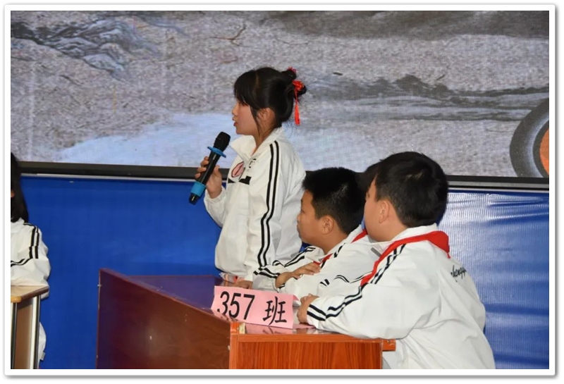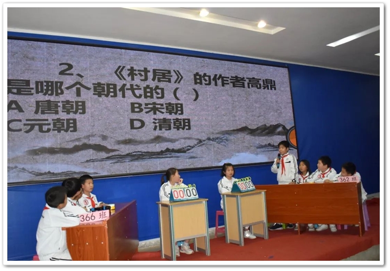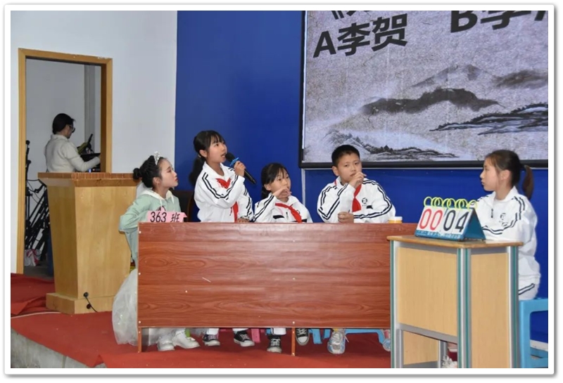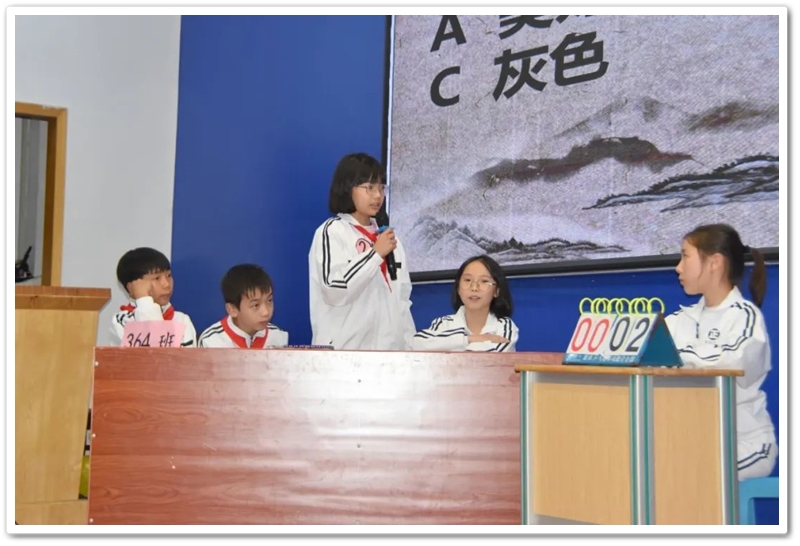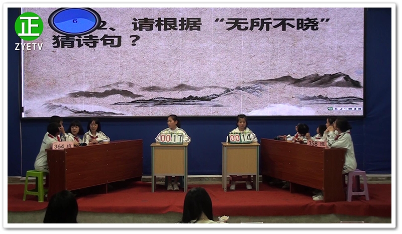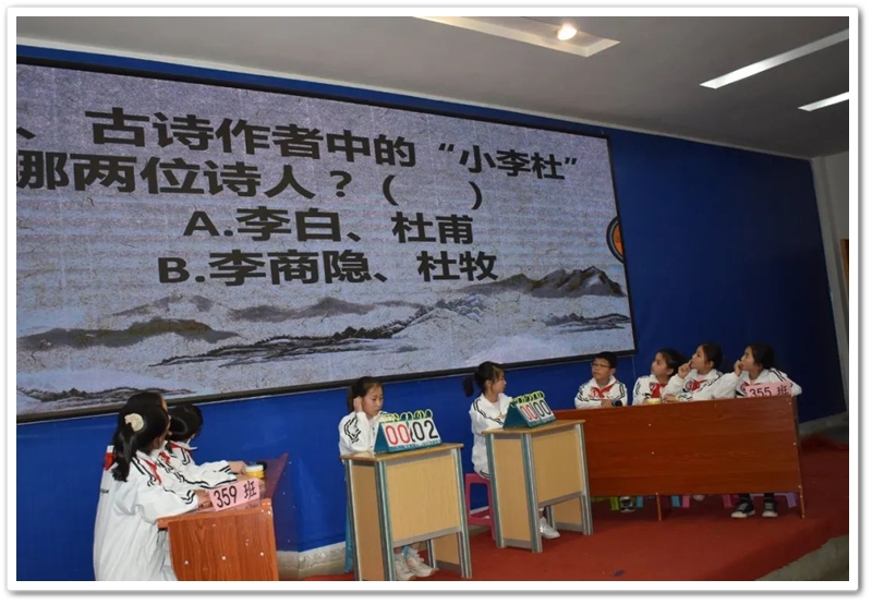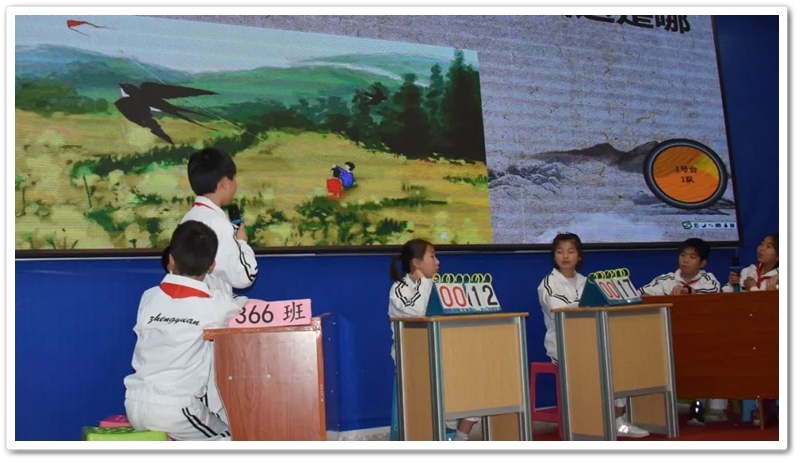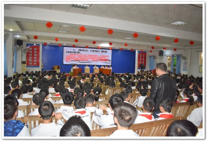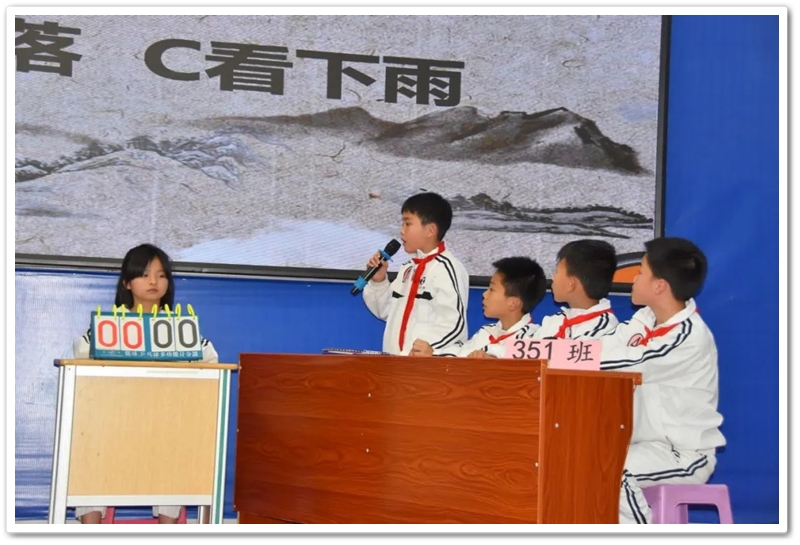 本次诗词大会竞赛共有17个班级代表队参加,各班挑选4名优秀选手参加年级比赛。比赛共有四个环节。第一环节:必答题,每个代表队的队员轮流作答;第二环节:对对碰,队员需在15秒以内把诗句补充完整;第三环节:抢答题,两边队员以抢答的形式根据图片或文字提示说出相关诗句或诗名、作者;第四环节:翻译题,两边队员以抢答的形式说出一句诗或一首诗的意思。