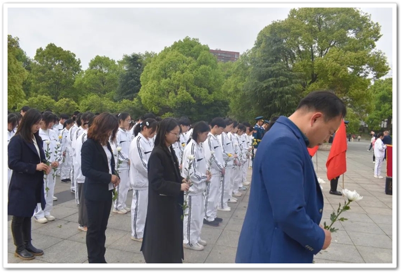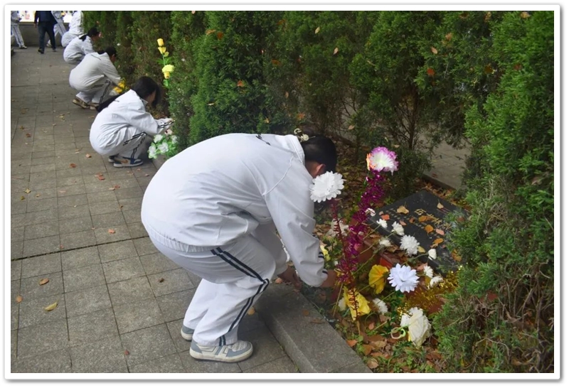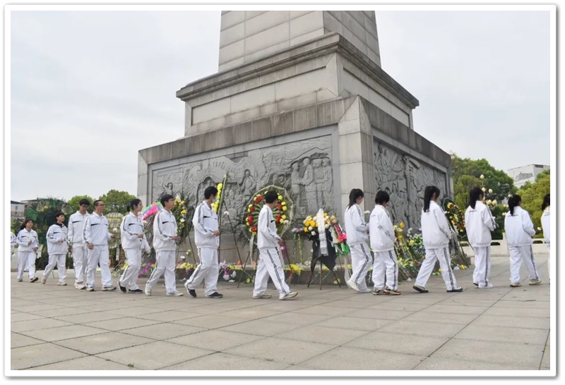 祭扫仪式最后一项,环场瞻仰烈士碑陵。师生依次缓步绕场瞻仰烈士碑陵,将手中的花束、花朵敬献烈士墓前。