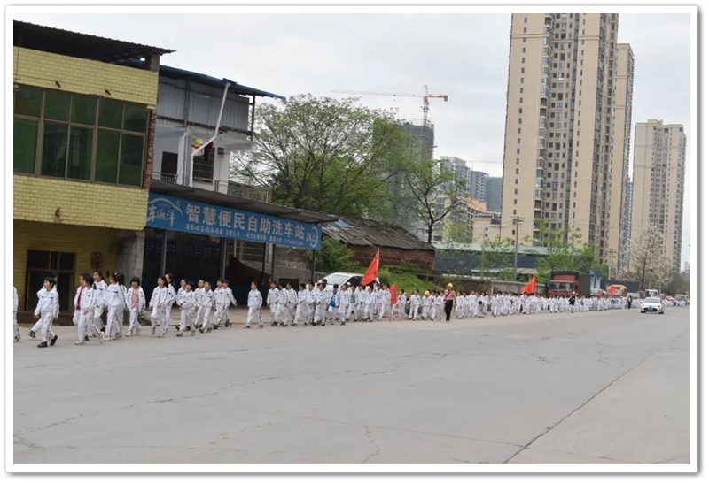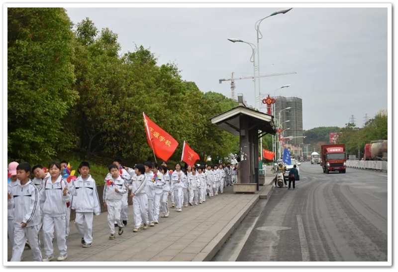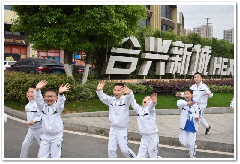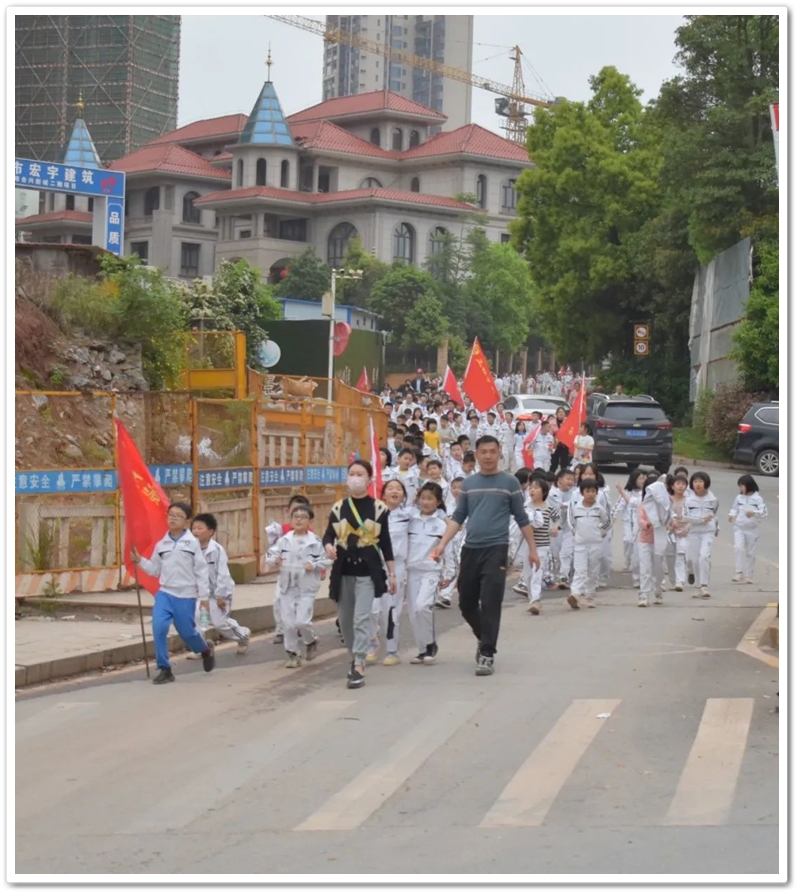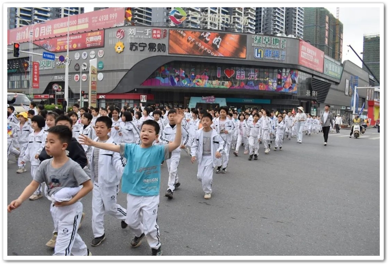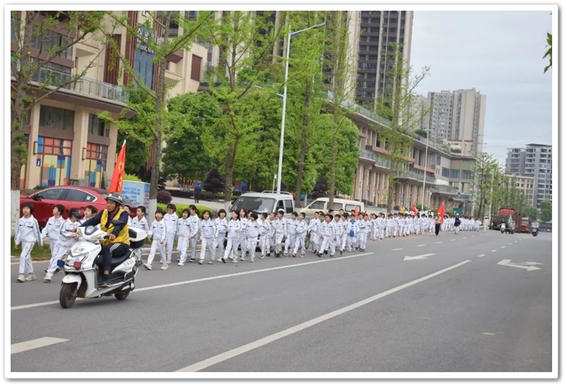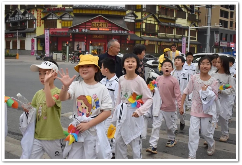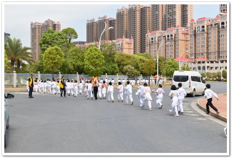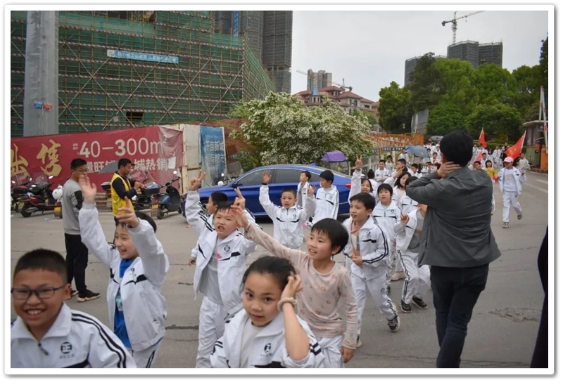 8点30分浩浩荡荡的一条“白色长龙”游动起来了。在班主任的带领下,孩子们一路上欢声笑语,兴奋不已。看见路上好奇的行人驻足,还会热情大方的挥动小手打招呼“爷爷好!”“阿姨好!”“你好!”“我们是正源学校的小学生!”......回应大家的则是饱含笑意的点头示意,或者高高竖起的大拇指。这让孩子们更加心花怒放。