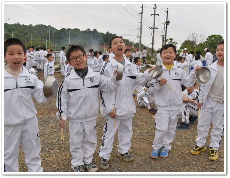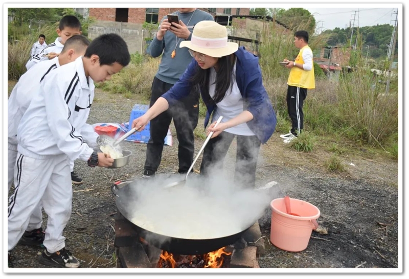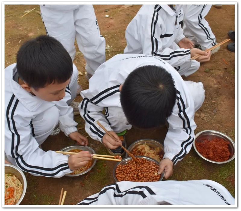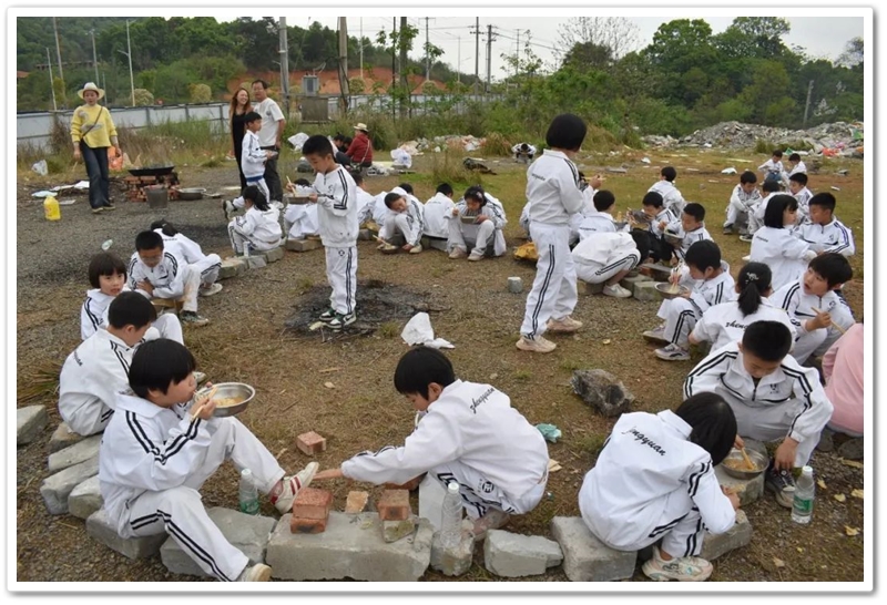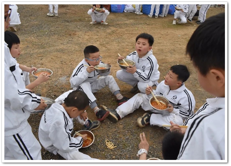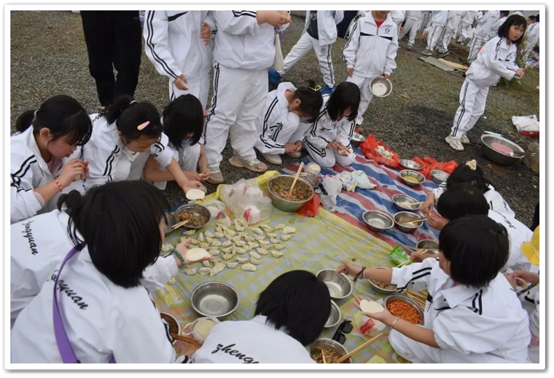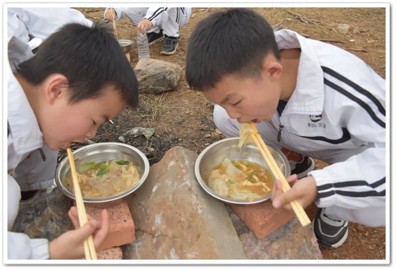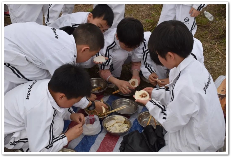 来到了野炊地点,大家更是兴奋不已。根据事先分好的小组,大家三五成群,在老师的安排下开始了“自助餐”。柴火组负责烧火拾柴,饺子组负责包饺子,后勤组负责发放碗筷物品,环保组负责过后收拾清理场地垃圾。还有啦啦组的同学在一旁为大家加油打气。一切都是那么和谐、有条不紊的进行。食物的美味更是让孩子把一路的劳累抛之脑后,又重新恢复活力。