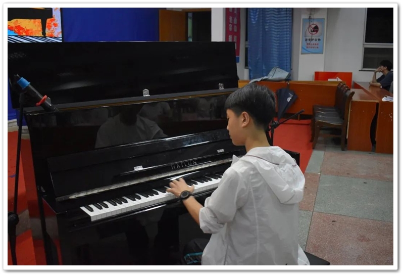 在主持人宣布完评分规则以及演奏要求后,迎来了初中部第一位参赛选手,他是初二年级507班蔡金鹏同学。他演奏的曲目是《童年的回忆》,童年似一杯淡淡的茶,让你回味;童年似暴风雨后的彩虹,五彩缤纷;童年似弯弯的小路,让你成长。这样一首旋律优雅的乐曲通过蔡同学的指尖静静流淌出来,让人回味无穷。
