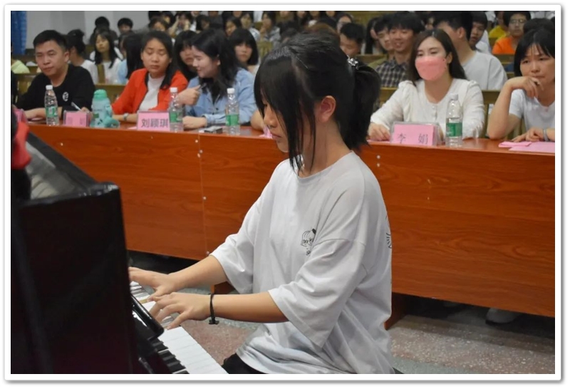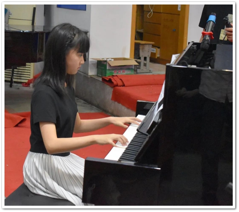 第六位选手是艺术部479班王敏同学,她演奏的曲目是《克列门蒂小奏鸣曲》,此曲活跃而富有朝气、优雅而明快,旋律中连音与跳音给人以深刻的对比,王同学左右手配合起来好像左右手在互相对话。