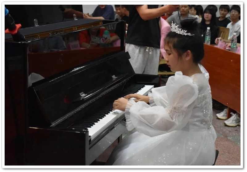 第十二位选手是准初一年级560班曾书怡同学,她演奏的曲目是非常好听的中国风钢琴曲《梁祝》,《梁祝》取材于一个古老而优美动人又家喻户晓的民间传说《梁山伯与祝英台》,曾同学优雅大方,现场的评委老师与观众无一不动容于曾同学指尖所流淌出的旋律。