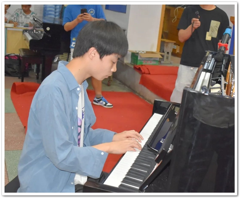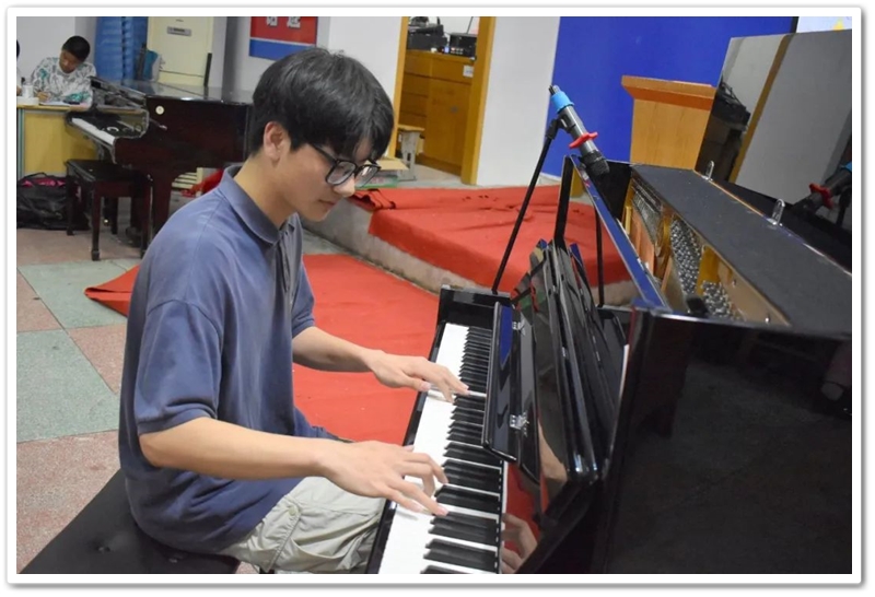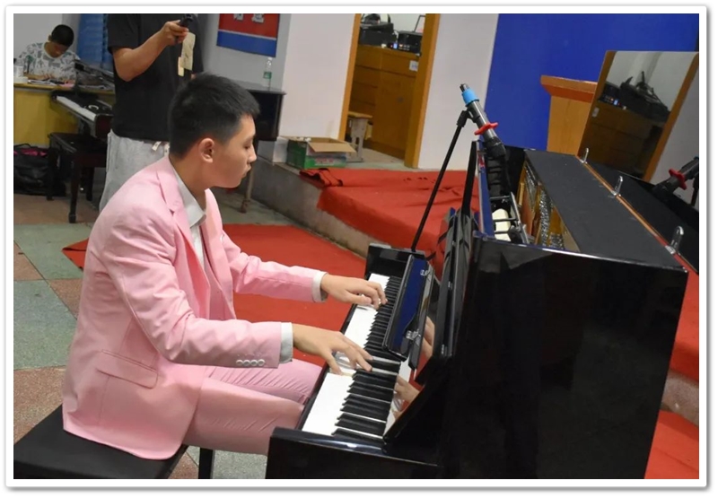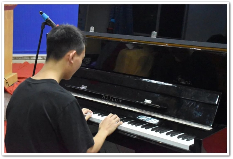 第四位选手是艺术部521班唐旭同学,他演奏的曲目是《车尔尼599第45条》,这是一首综合了多种演奏技法和音型的练习曲,既有连跳弹奏的区别,又有和弦、音阶与短琶音的音型变化,还有左右手的交替练习。唐同学通过一段时间的刻苦练习,最后终于成功拿下此曲!