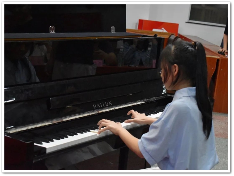 第八位选手是初三年级466班文阳乐同学,她演奏的曲目是《贝多芬奏鸣曲悲怆第三乐章》,这首乐曲是回旋奏鸣曲式,优美的旋律中带有欠稳定的游移情绪,似乎处于一种徘徊不定的心态之中。一开头便是如雨珠倾泻而下的连奏,主题洋溢着青春的明快和不可抑制的生命活力,文同学以一种宣言式的坚定气场表达了真正坚强稳定的意志,让人领略到她的自信和潇洒。