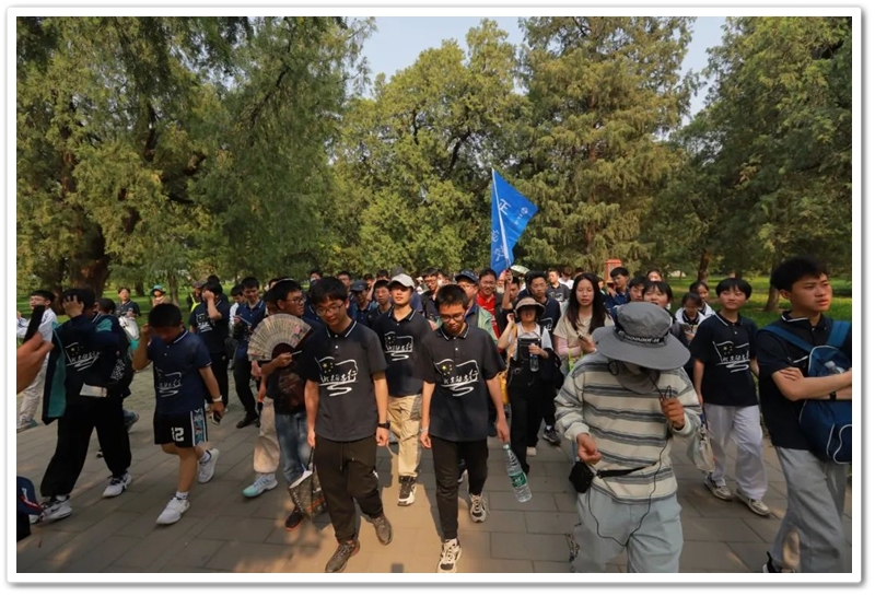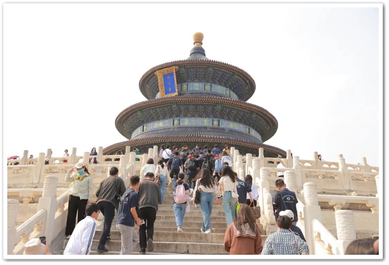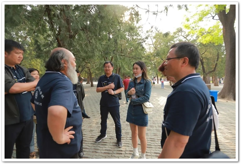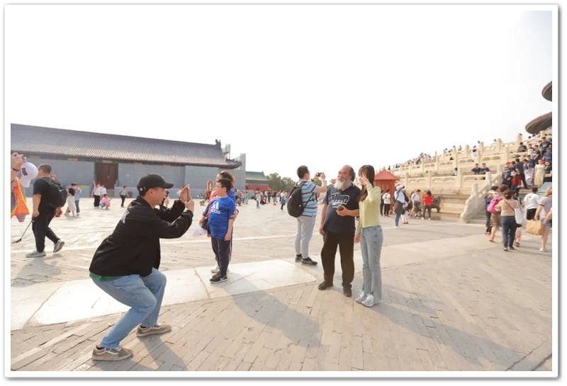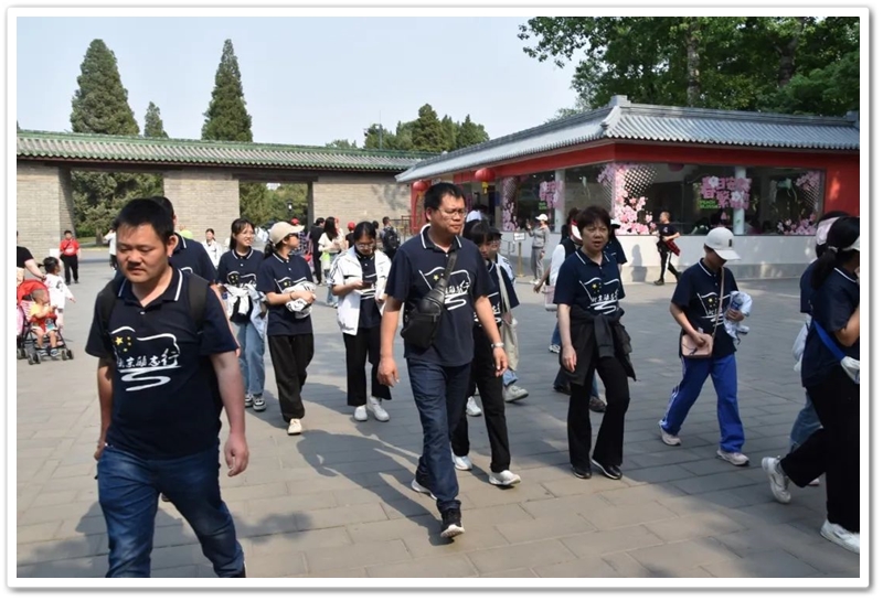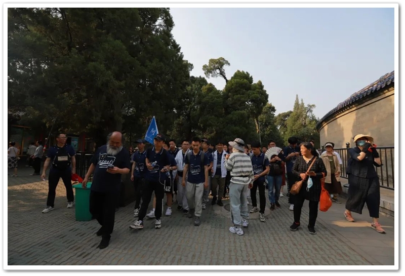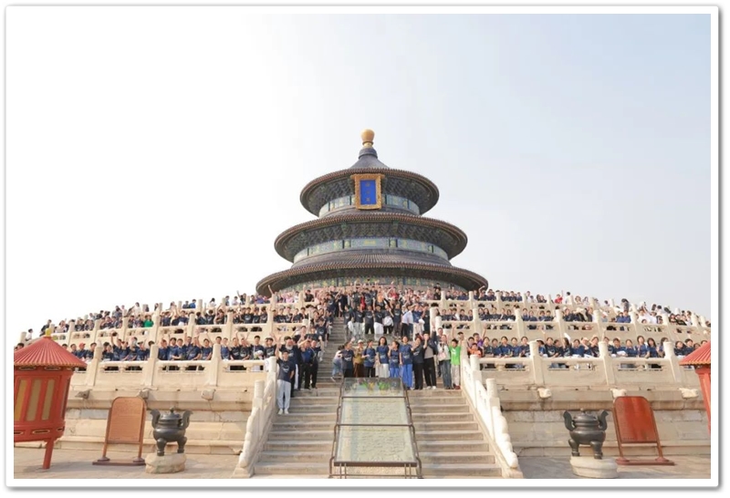 昨天游览长城、天安门大家穿的是“正源红”T恤,换洗过后,今天穿着的“正源蓝”T恤恰好与蓝瓦金顶的祈年殿交相辉映。此情此境,自当合影留念,“正源蓝”顷刻间将三尺天坛栏杆填得盈盈满满,天、地、人水乳交融,恰是融为一体,浑然天成。