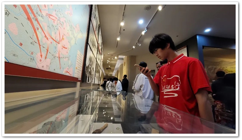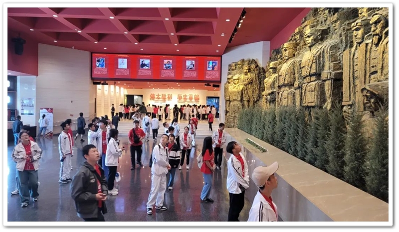 连日里风风火火赶行程,这次进入抗日战争纪念馆,罗校长特意叮嘱要留足两个小时,让同学们不要赶时间,认认真真仔仔细细参观。中国局部抗战、全民族抗战、东方主战场、伟大胜利、铭记历史等八大主题部分及台湾同胞抗日史实展馆逐一看完,蕴含其中的抗战精神——天下兴亡匹夫有责的爱国情怀、视死如归宁死不屈的民族气节、不畏强暴血战到底的英雄气概、百折不挠坚忍不拔的必胜信念,令人热血沸腾、心潮澎湃。