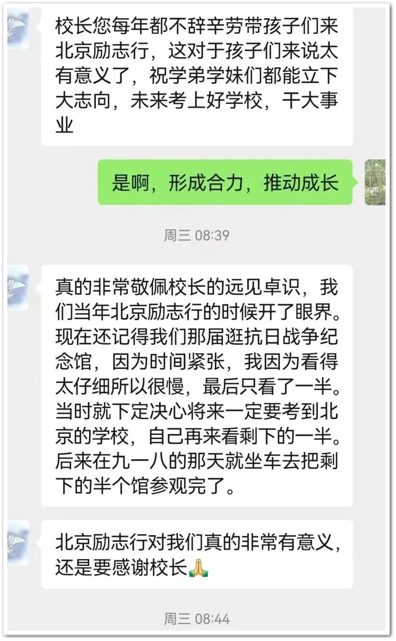 卢沟桥北就是宛平城,抗日战争纪念馆就在宛平城内。2021届以物理方向考取清华大学社会科学类的徐珂娟在微信上跟罗校长说,当年的北京励志行对她触动很大。当年她在抗日战争纪念馆看得很仔细,只看到一半时间不够了,只得依依不舍离开。剩下的一半,是她考上清华后,在九一八当天自己坐车过来看完的。