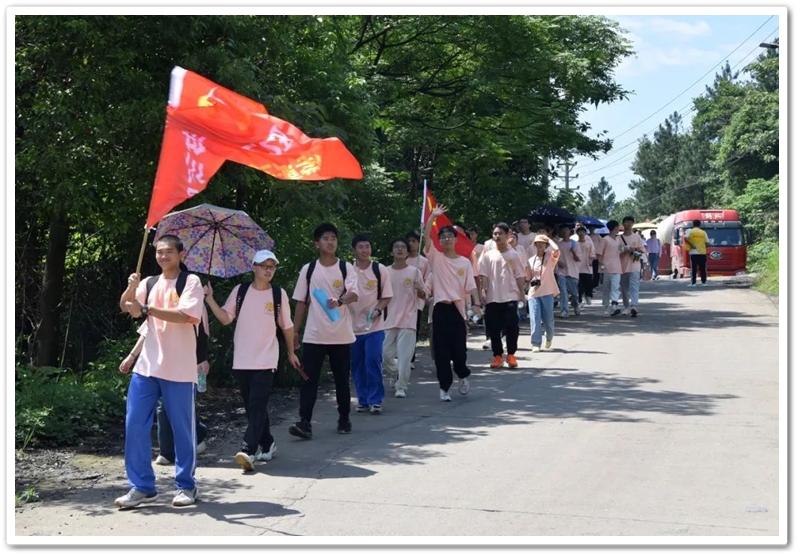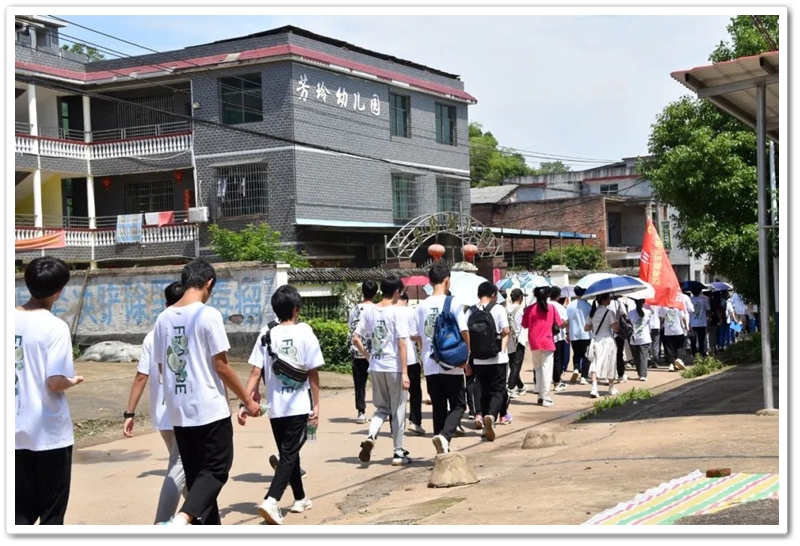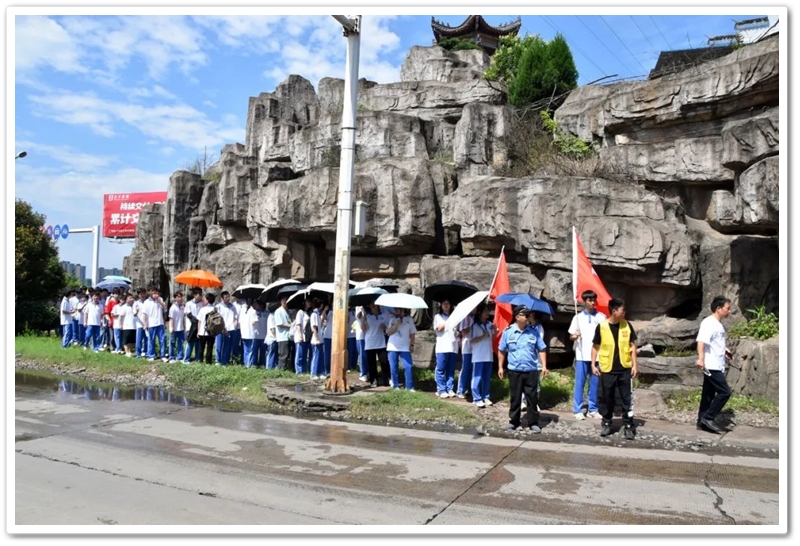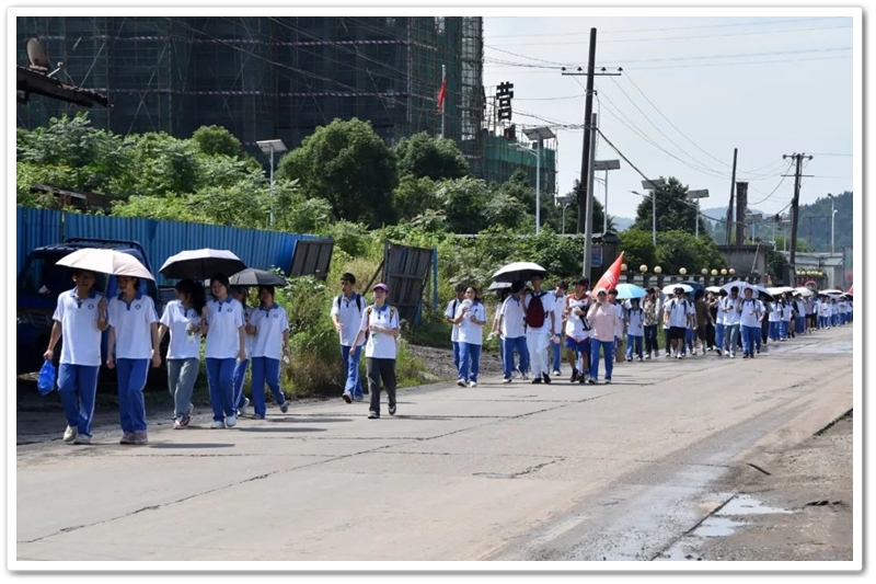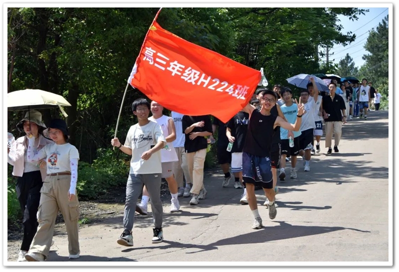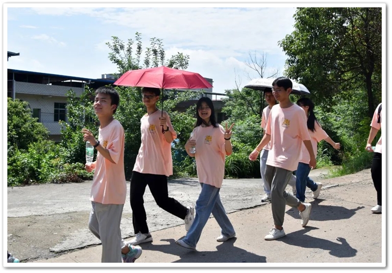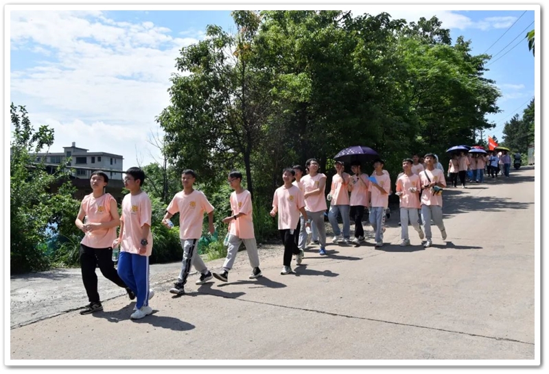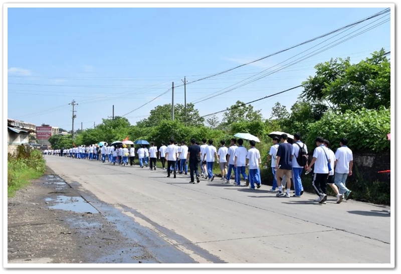 9:50,高三年级32个班级拍完毕业照。罗校长挥舞红旗一马当先,率领1800多名高三同学踏上远足休闲之旅,浩浩荡荡徒步7公里,奔赴三架街道七岭社区黄泥嘴村。