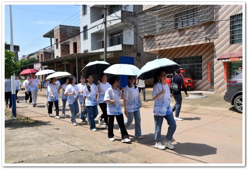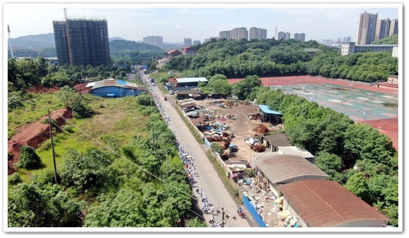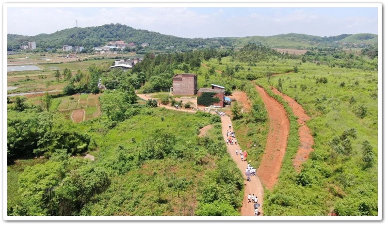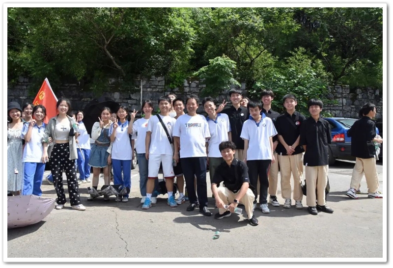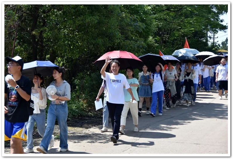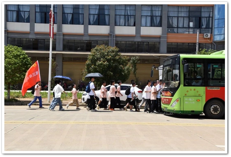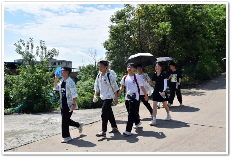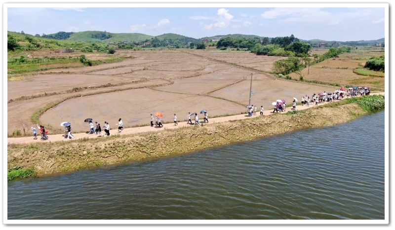 9:50,高三年级32个班级拍完毕业照。罗校长挥舞红旗一马当先,率领1800多名高三同学踏上远足休闲之旅,浩浩荡荡徒步7公里,奔赴三架街道七岭社区黄泥嘴村。