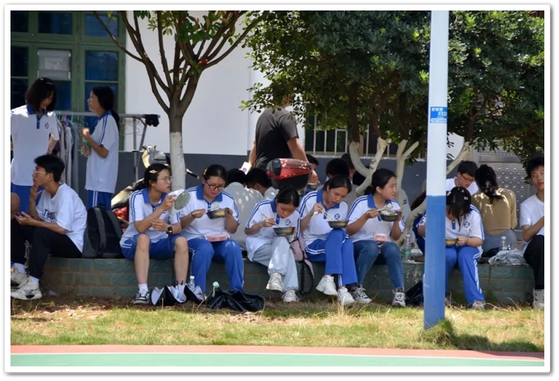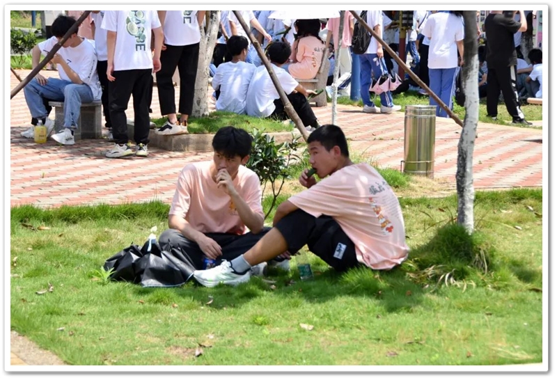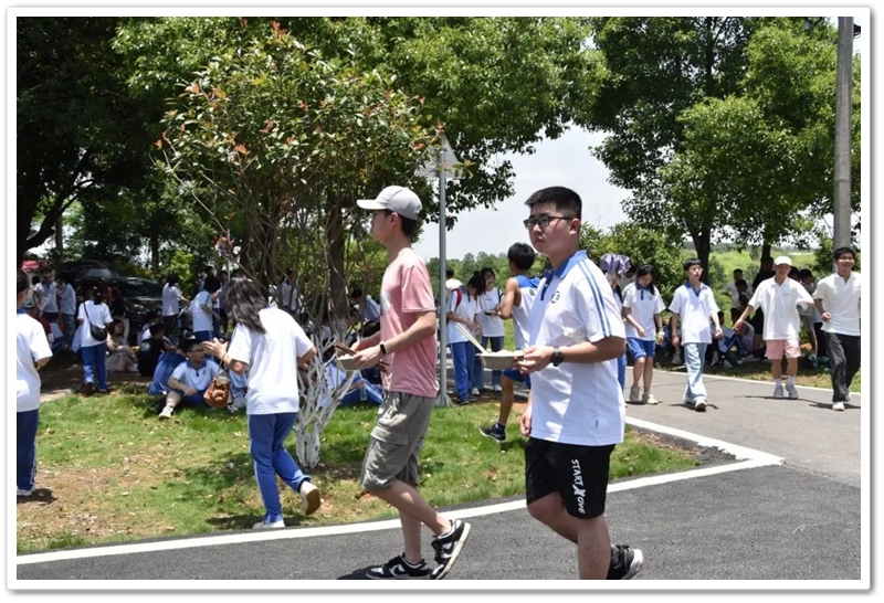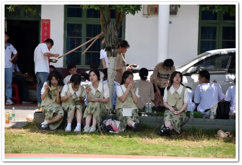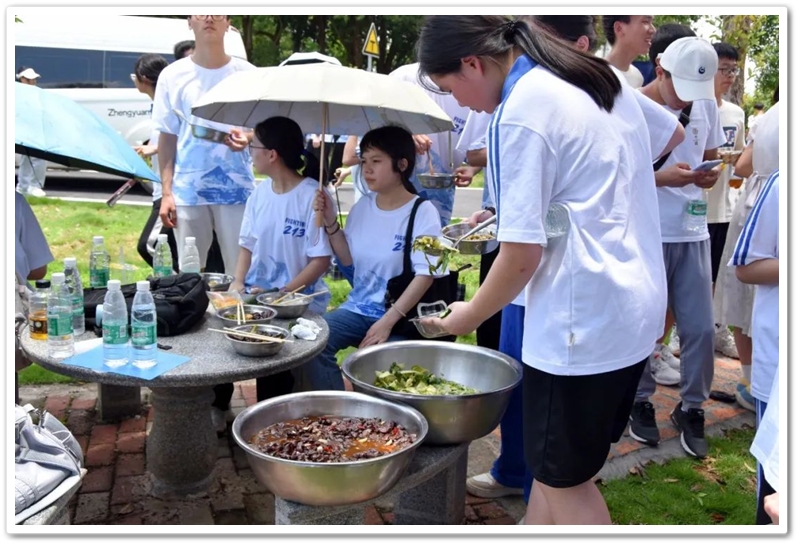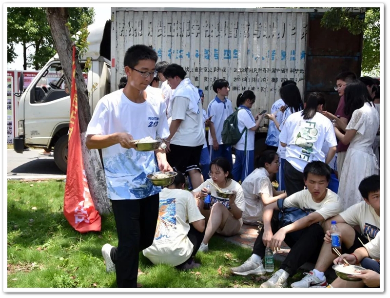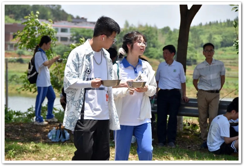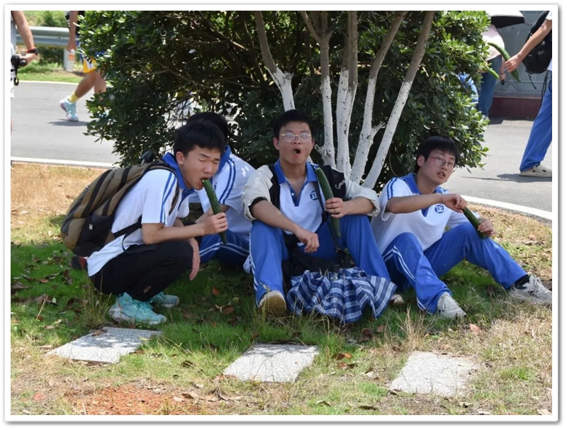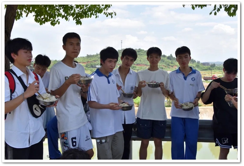 一路欢声笑语,一路轻松惬意,抵达黄泥嘴湾村广场时已近中午。学校食堂恰逢其时运来黄瓜、矿泉水,安置好餐桌餐具。同学们或席地而坐,或闲庭漫步,小憩一小时,野餐过后移步到附近的开发区创新创业园登车返校,养精蓄锐准备迎战高考。