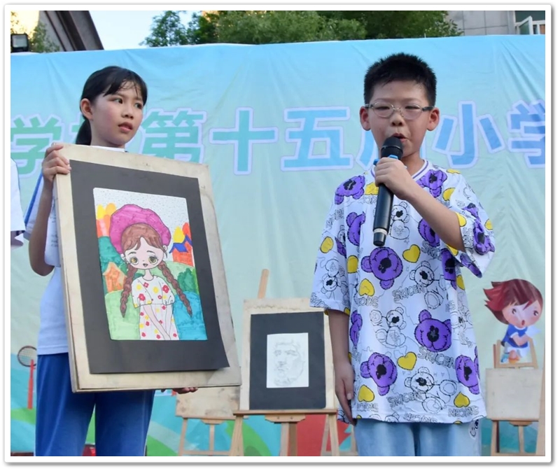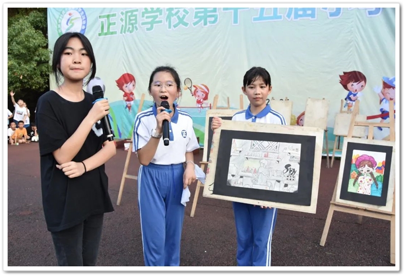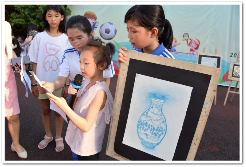 可爱的动物头套舞、动听的独唱歌曲《wake》拉开了活动的序幕。本届拍卖会选取了8幅作品参拍,分别来自六年级342班罗子萱的《一个人在灯下》、曾智的《素描石膏头像》,五年级350班曾翠婷的《双龙戏珠》、352班张家贝的《青花韵》、352班潘靓的《青花瓷》、359班李炻莹的《动漫人物》、360班王曦博的《十二星座》,三年级398班何迎月的《小女孩》。
