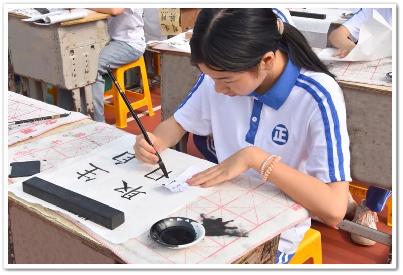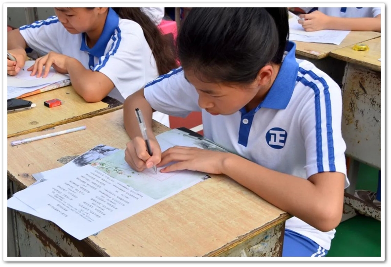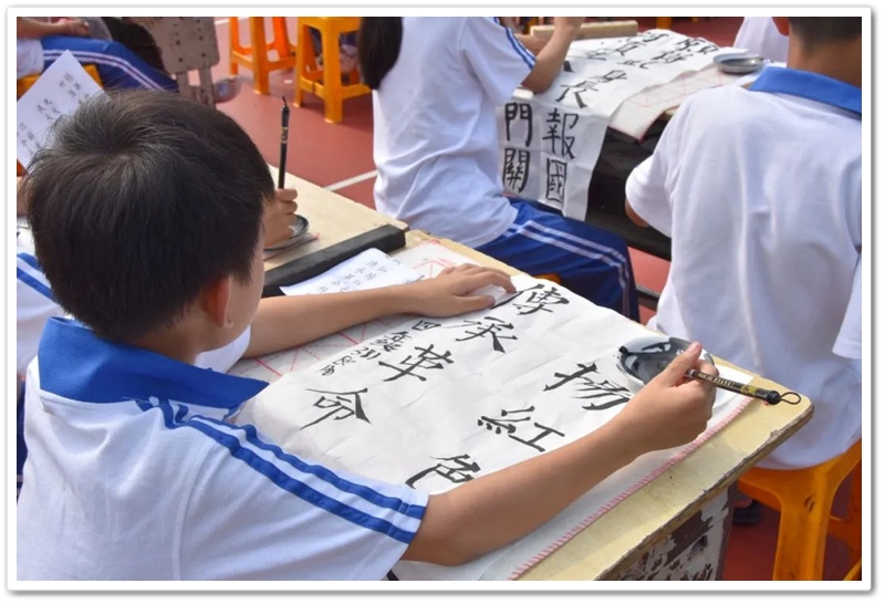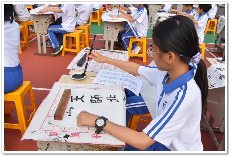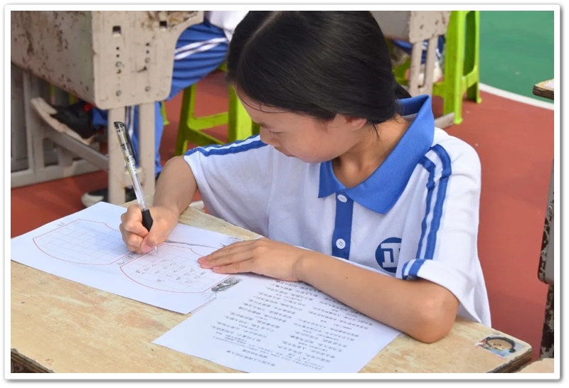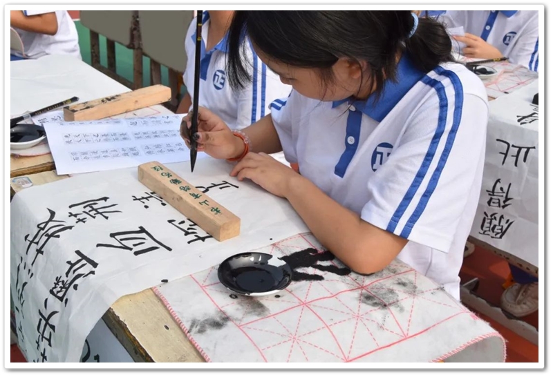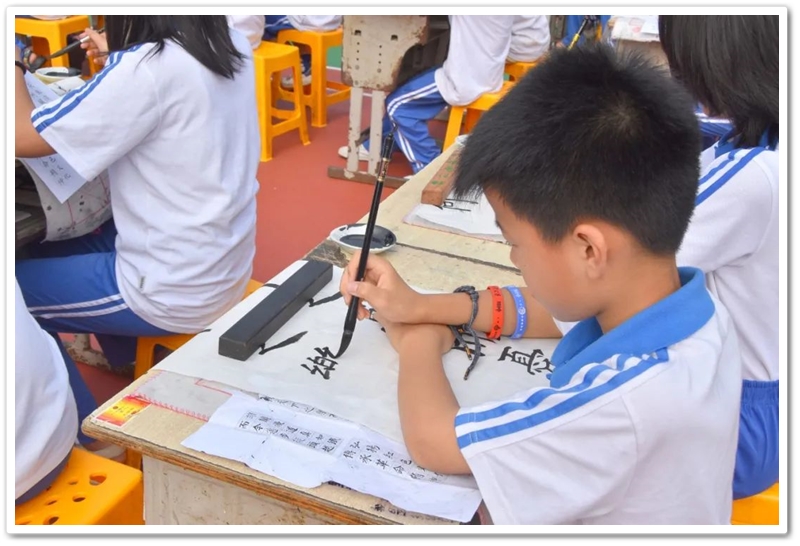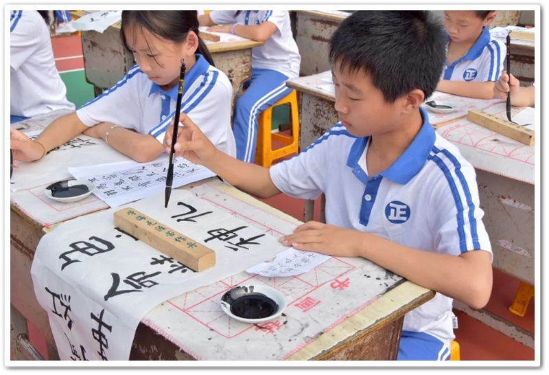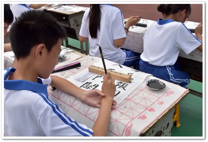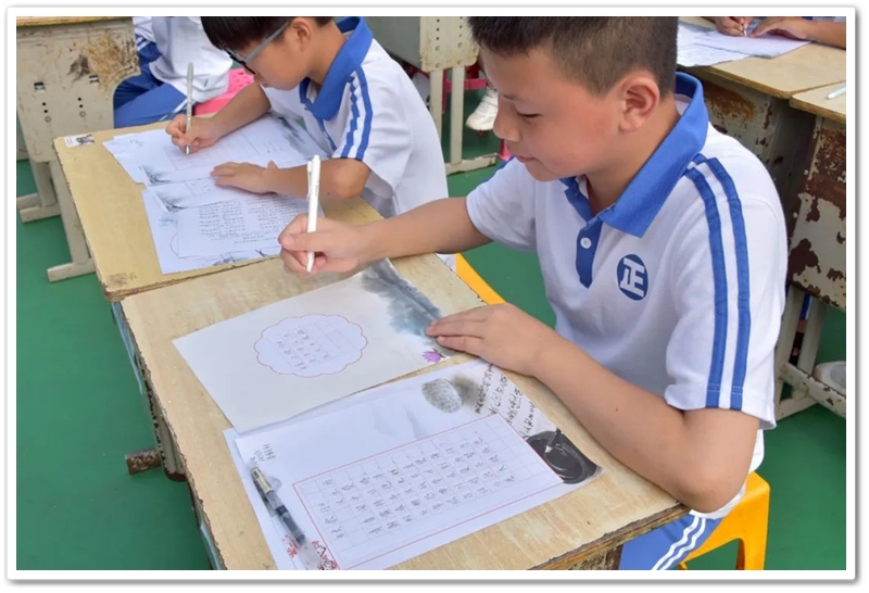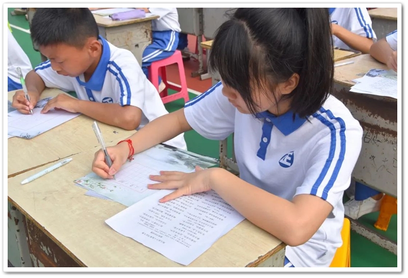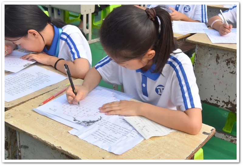 本次活动以誊写古诗词为创作素材。学生们根据比赛内容,一丝不苟地书写着。他们个个坐姿端正、凝神聚气,用心书写一撇一捺,努力展示着自己的书写才能。