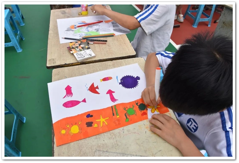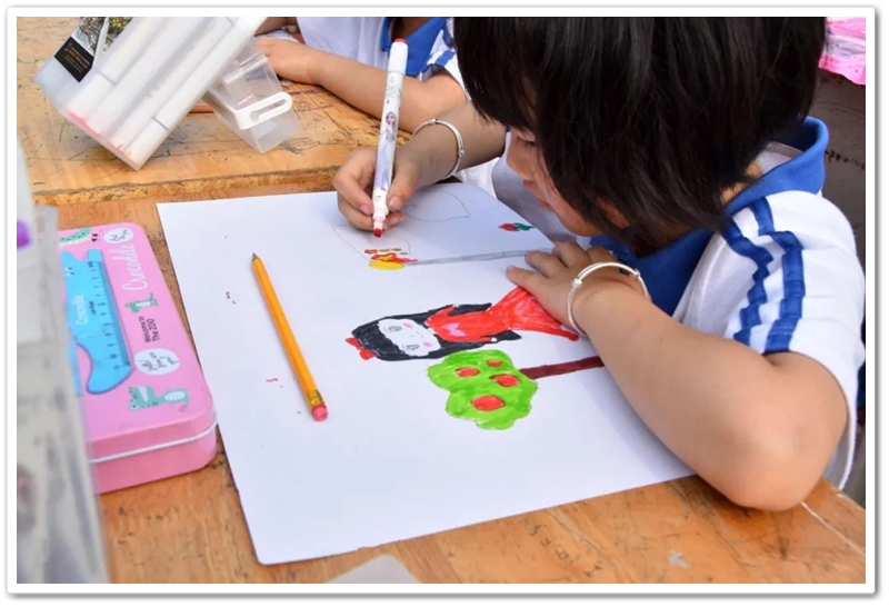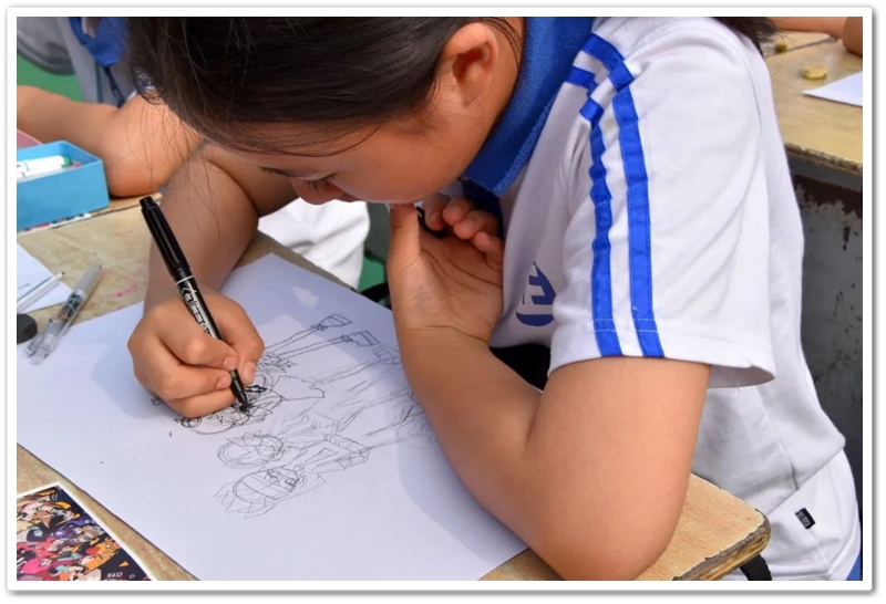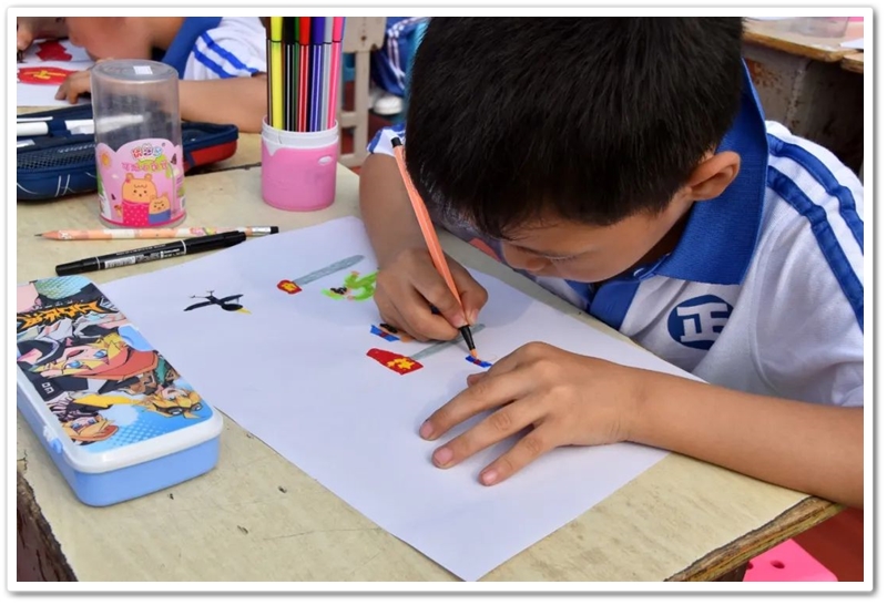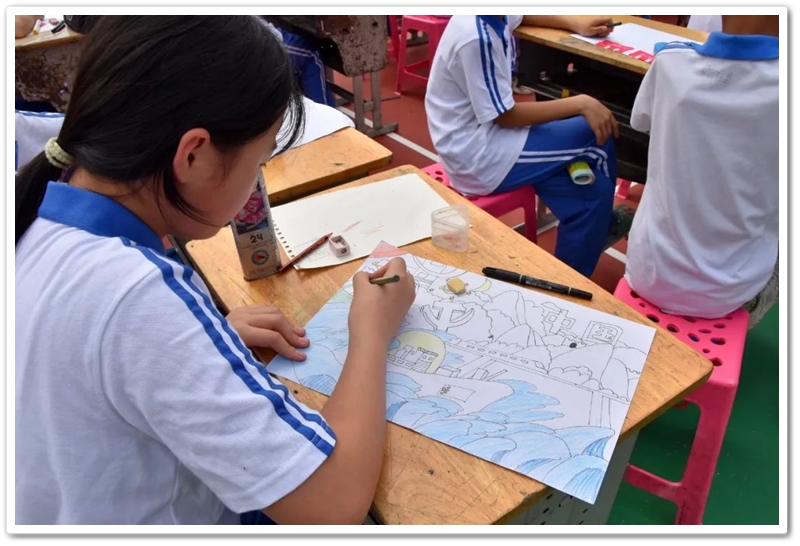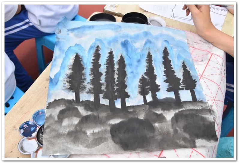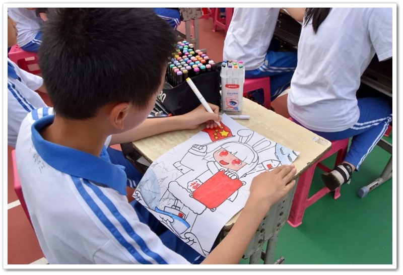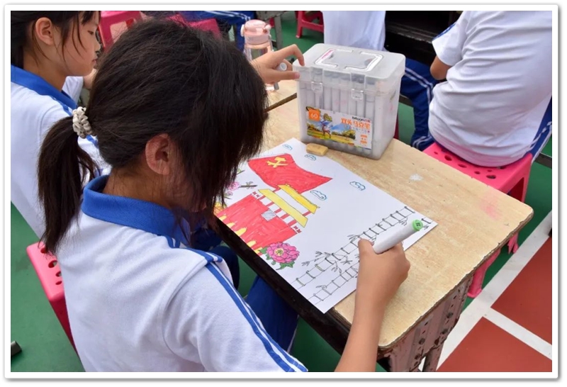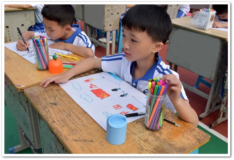 四年级学生专心致志,运笔于心,运用笔、墨、纸、颜料等工具,描绘心中梦想,表达了对祖国的美好祝福。