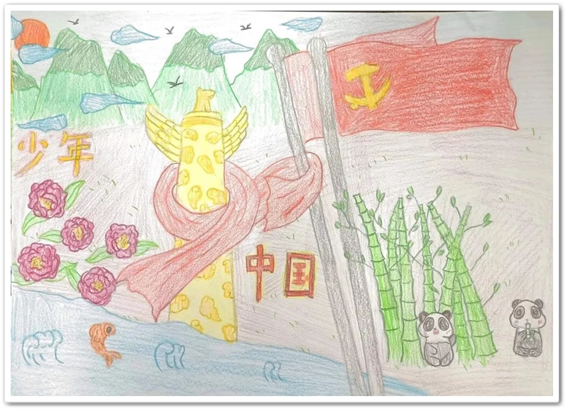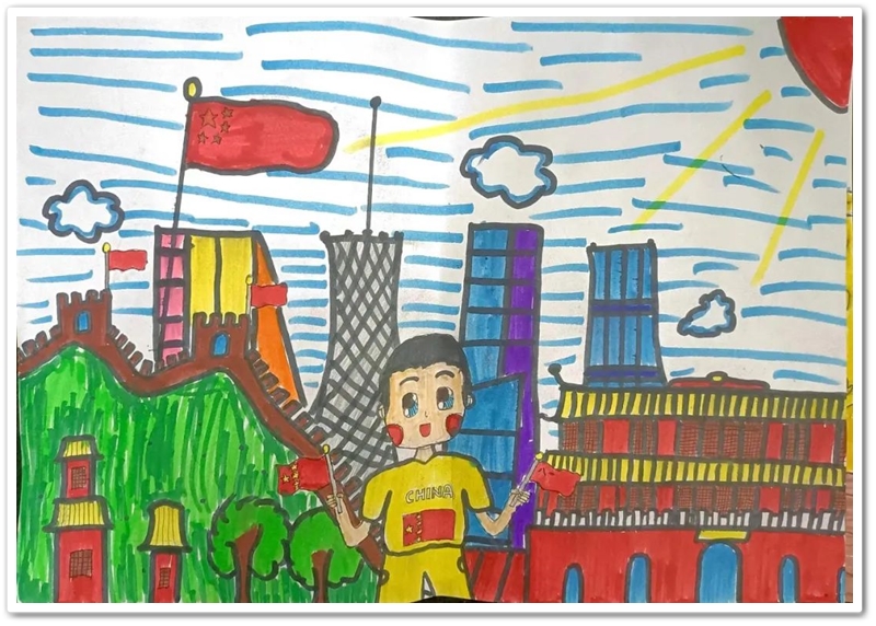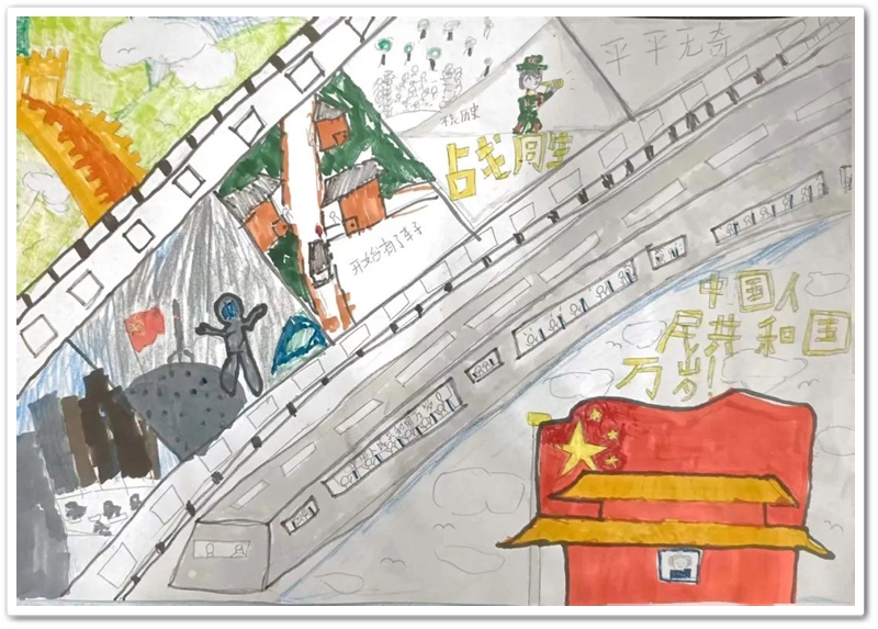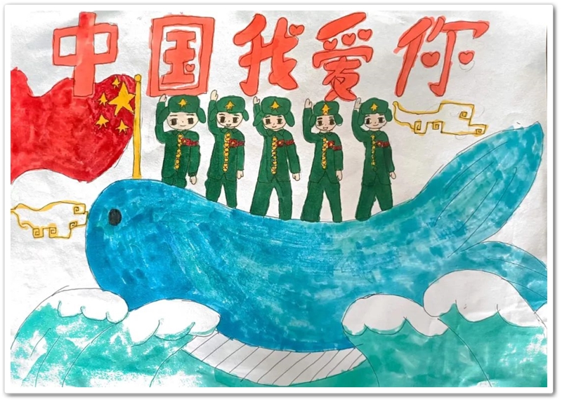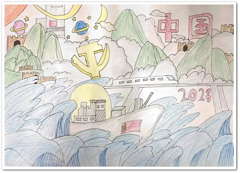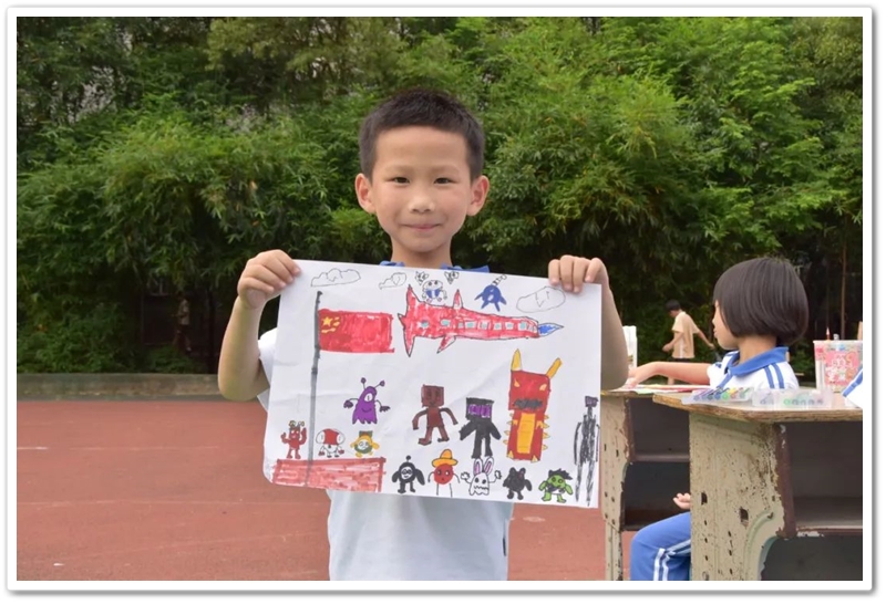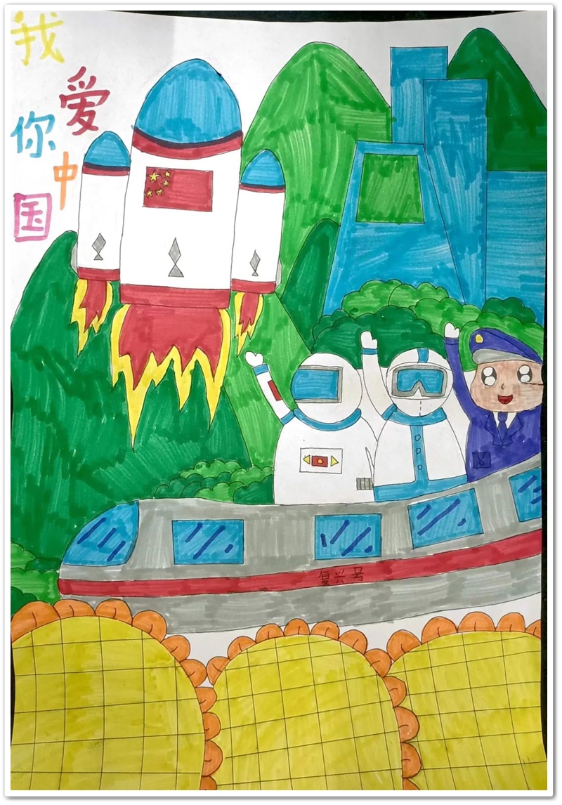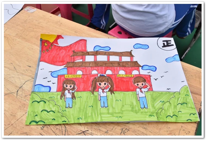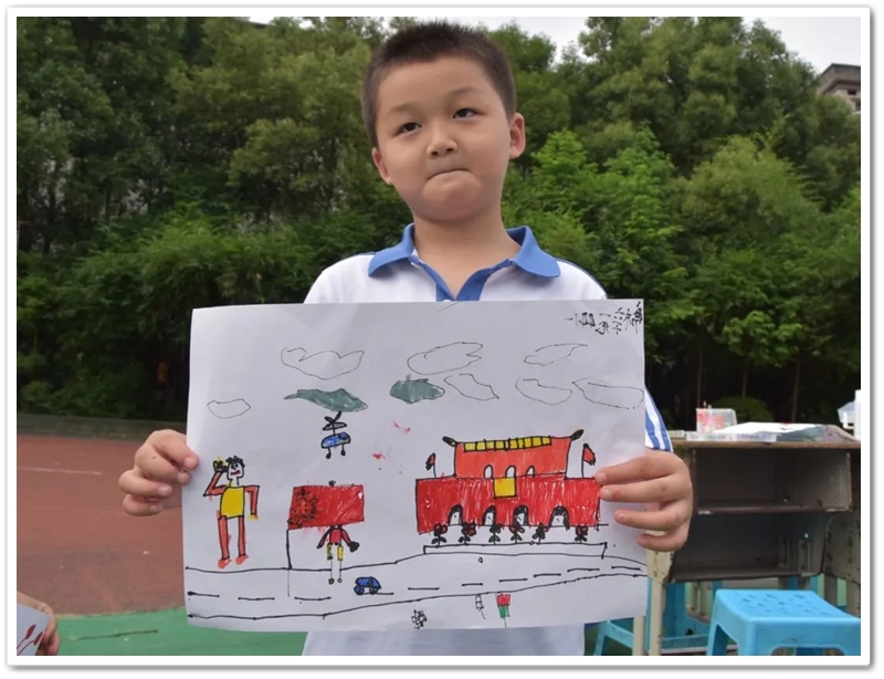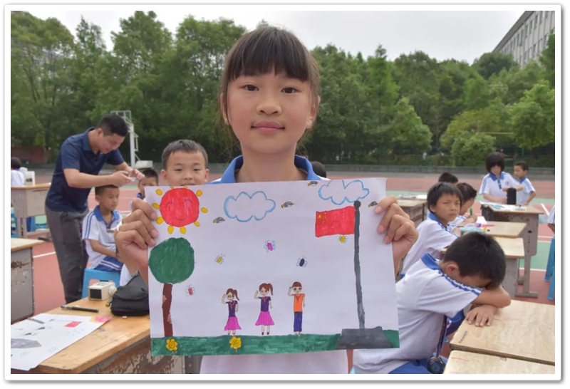 二年级学生充分发挥想象,创意构图,用画笔勾勒成长的点滴,用鲜艳的色彩描绘阳光般的童年。一幅幅富有童趣的绘画表达了对快乐成长的美好愿望和爱国爱党的热情。