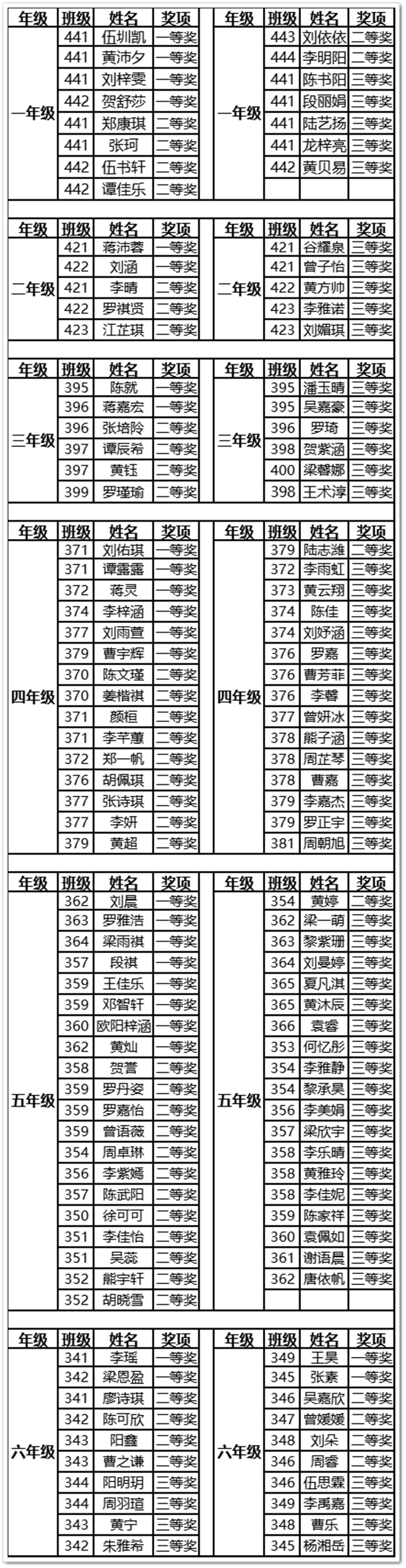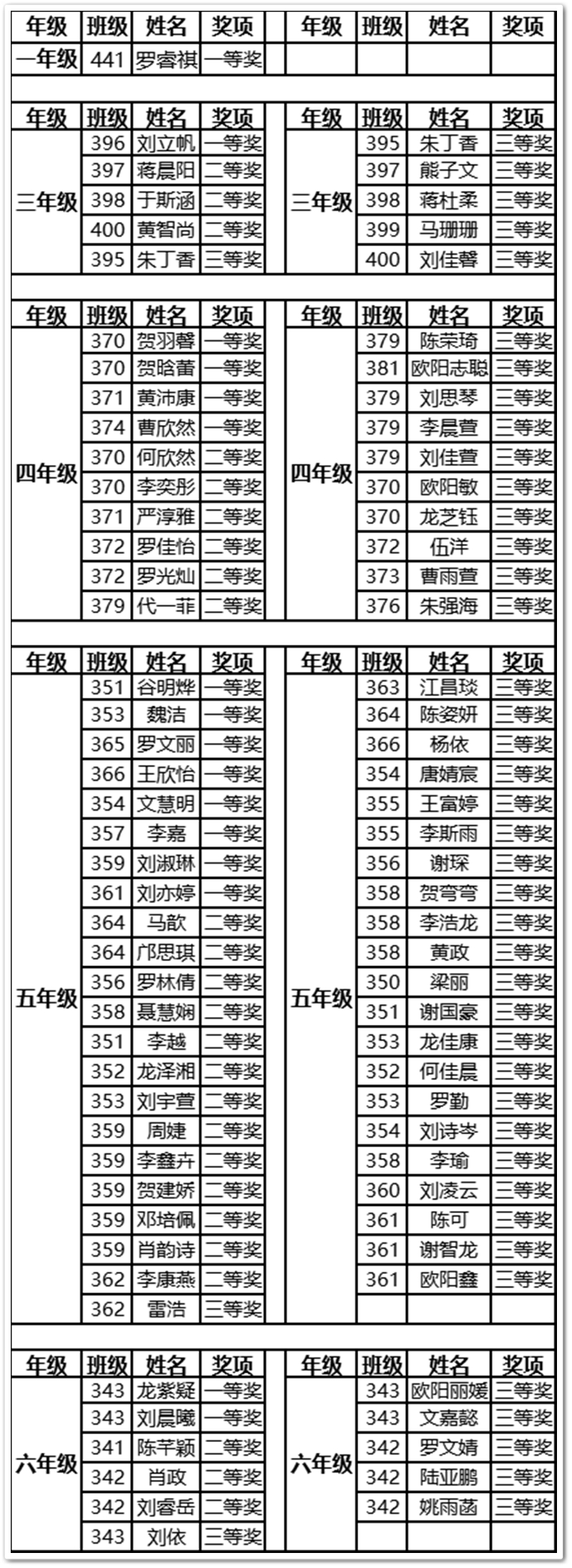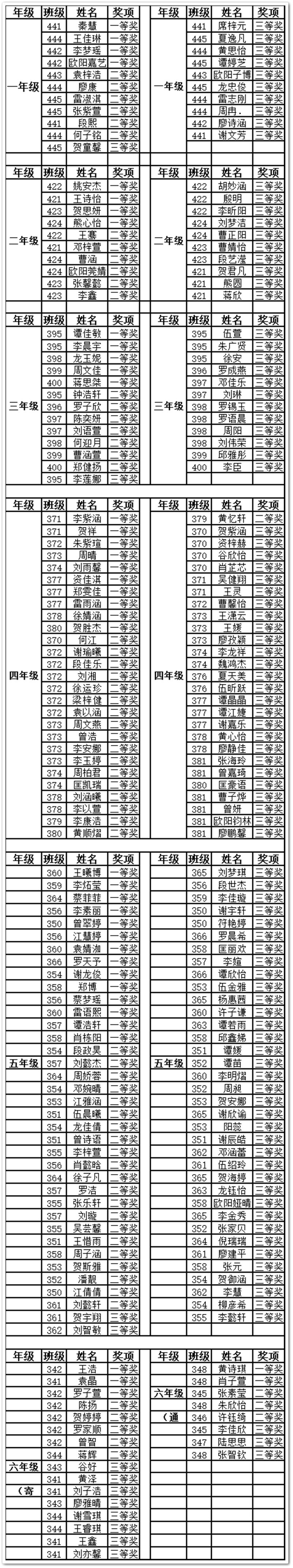 四年级 | 370 | 贺羽馨 | 一等奖 | 四年级 | 379 | 陈荣琦 | 三等奖 | |
