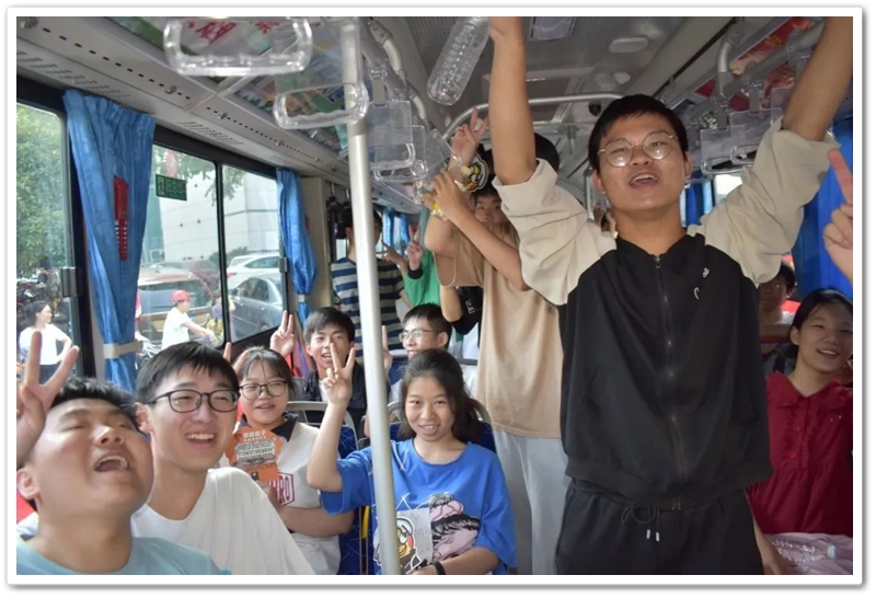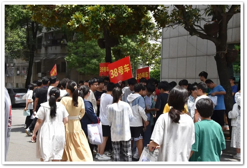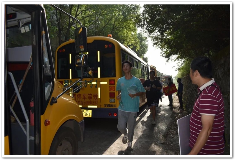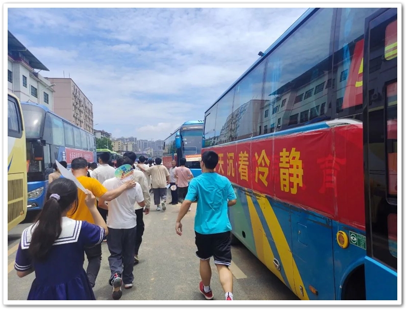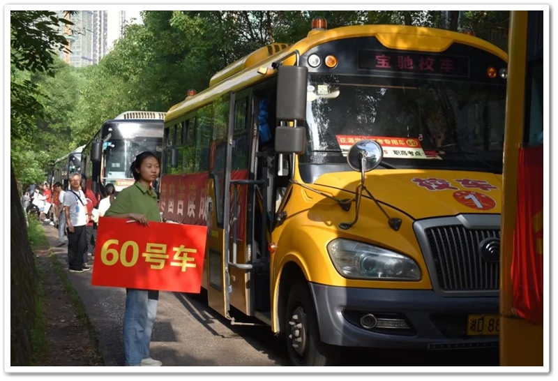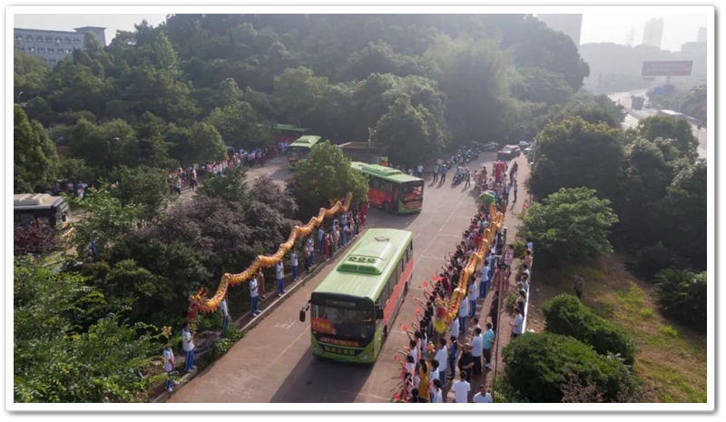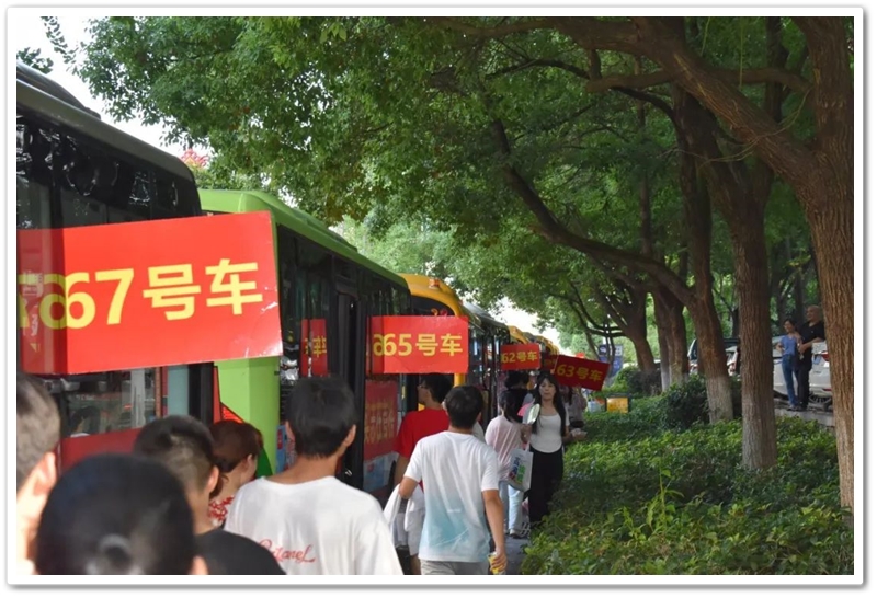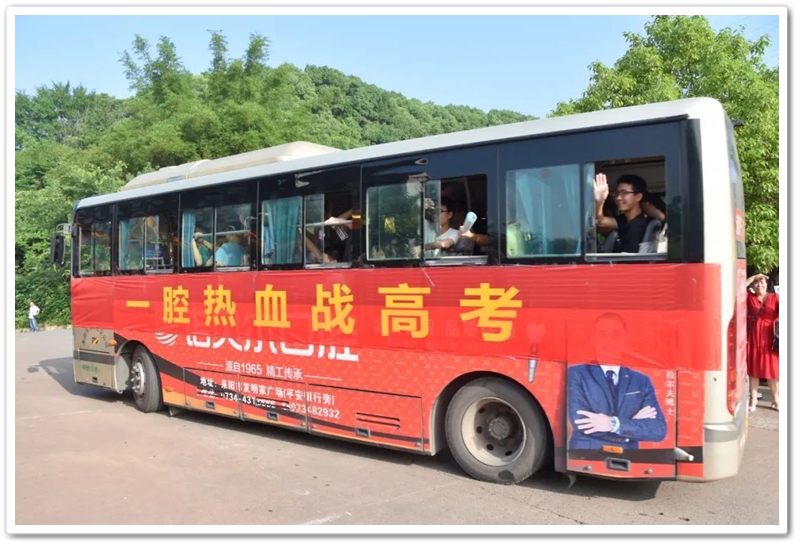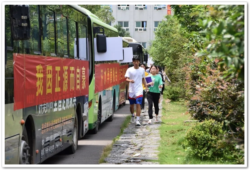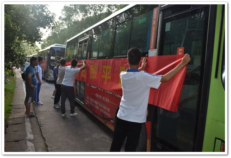 为1800多名考生准备的58台送考公交车分列环校路东西两侧,高二学弟学妹们正全神贯注张贴车身横幅,为即将出征赶考的学哥学姐们送上吉祥如意的高考祝福。