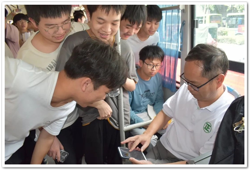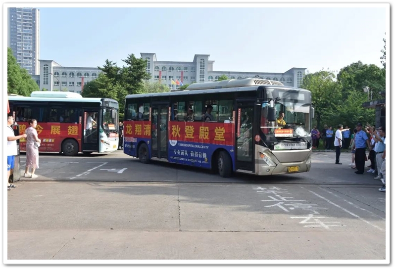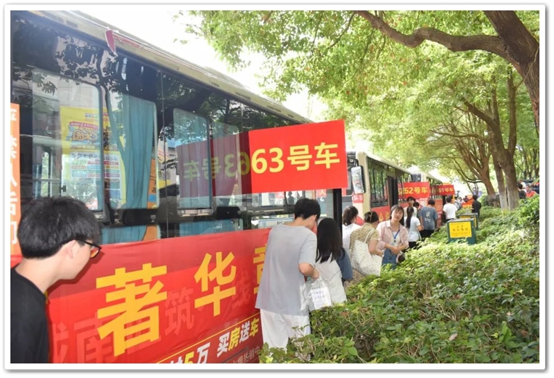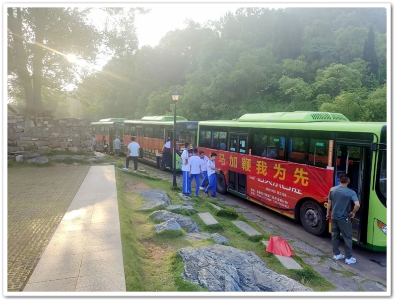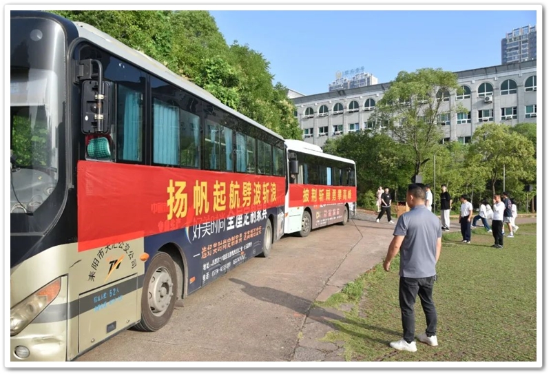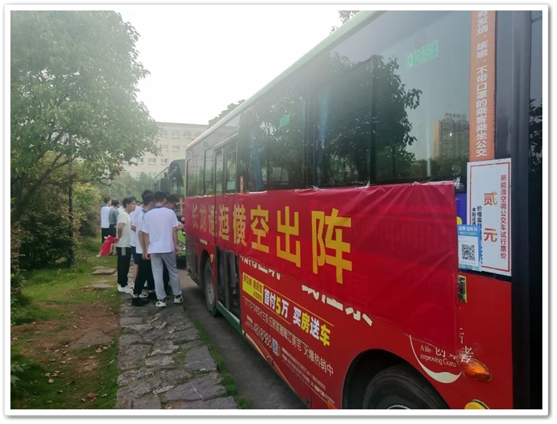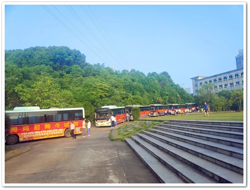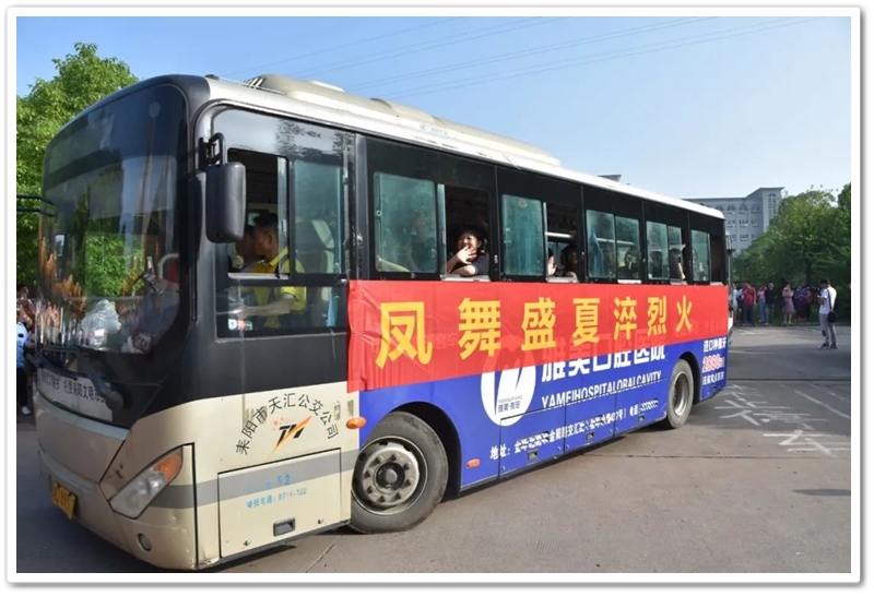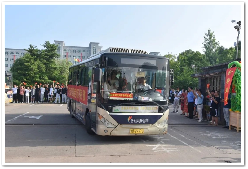 为1800多名考生准备的58台送考公交车分列环校路东西两侧,高二学弟学妹们正全神贯注张贴车身横幅,为即将出征赶考的学哥学姐们送上吉祥如意的高考祝福。