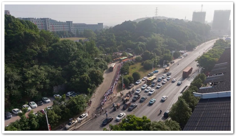 送考车队浩浩荡荡鱼贯而出,化成三条长龙,在交警沿途护送之下一路顺风顺水,直奔三大考点。