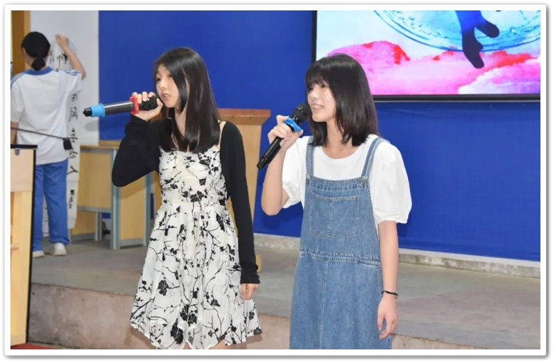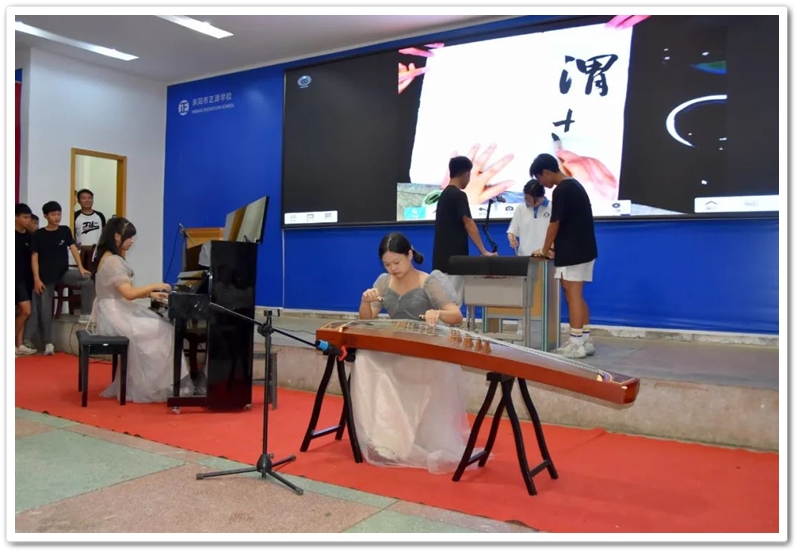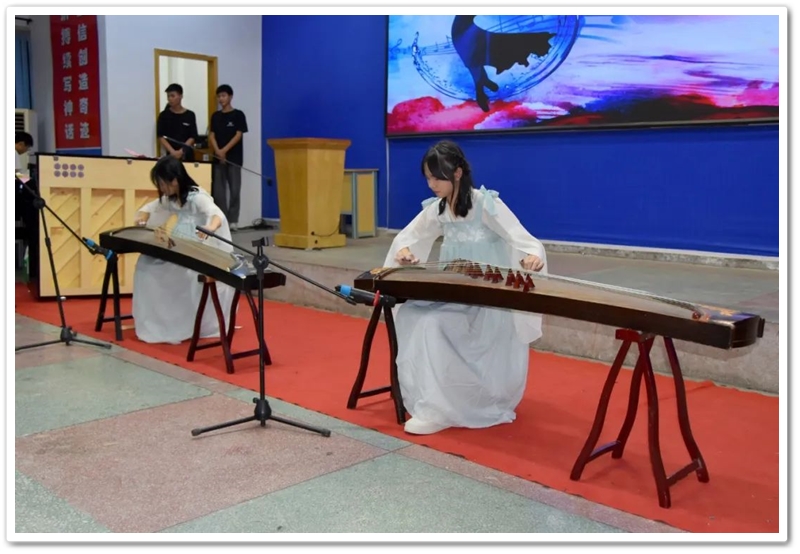 “无论夜有多长,天总会亮。借理想的微光,燃起一方晴朗……”张亮同学演唱的《你就是远方》,用激情澎湃的歌声道出了自己不畏风浪、勇往直前的信念。声乐4班、声乐1班和声乐2班合唱的歌曲《嘎达梅林》《把未来点亮》,展示了声乐专业生的实力,让听众感受到来自专业生的压迫感。同为声乐生的黄家耀、陈永康带来的歌曲《夕阳红》,则告诉大家每一个声乐生都不可小觑。王君慧和唐嘉欣两位同学合唱的《恶作剧》,声音空灵婉转,悦耳动听。李卓越同学演唱的《那些你很冒险的梦》,展现了少年们敢于做自己、勇于逐梦的勇气。在音符飘扬的会场里,张欣悦同学的古筝独奏《汨罗江上》,李凤、李欣雅、熊芷杰三位同学的古筝合奏《洞庭新歌》,带给同学们非同一般的亲身体验,筝音袅袅,荡气回肠,让听众尽情沉浸在古筝的独特魅力中。段雯同学和蒋雨菲同学演绎了两支独舞《马》《唯一》,作为舞蹈生的她们,舞姿曼妙,身轻似燕,赢得了现场一阵阵的掌声和喝彩。最让同学们激动的是,这次活动中穿插了美术生和书法生优秀作品的展示。柱体、人物、动物,美术作品皆栩栩如生;颜体、柳体、欧体,书法作品都尽显风骨。每当展示到同班同学的作品时,其他同学都会鼓掌欢呼,高喊班级口号。伴着王一帆和张欣悦器乐合奏的《青花瓷》,书法生陈逸菲同学现场泼墨,下笔行云流水,笔走龙蛇。由480班全体女生带来的服装走秀,将民族与时尚巧妙融合。汉服、旗袍、Lolita、运动装,不同风格的碰撞擦出激情的火花,可谓异彩纷呈。更让同学们意想不到的是,此次活动科任老师也有节目展示。一首《干杯》,寄托了老师们对学生的殷殷期盼、美好祝愿。台上台下成了一片热情四溢的海洋,会场气氛也达到了最高点!